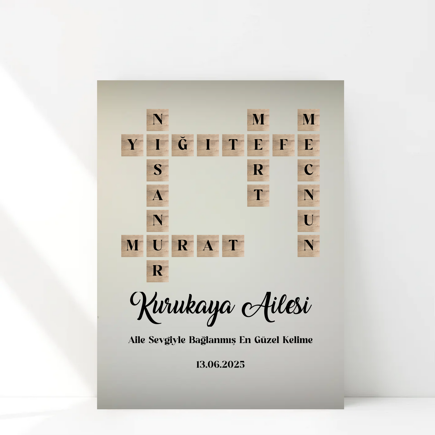 Scrabble tarzı kanvas tablolarla duvarlarınıza özgünlük katın. Harflerin gücüyle ailenizin, sevdiğinizin ya da özel bir kelimenin anlamını sanata dönüştürün. Kişiye özel tasarımıyla yaşam alanlarınıza hem şıklık hem anlam katın.