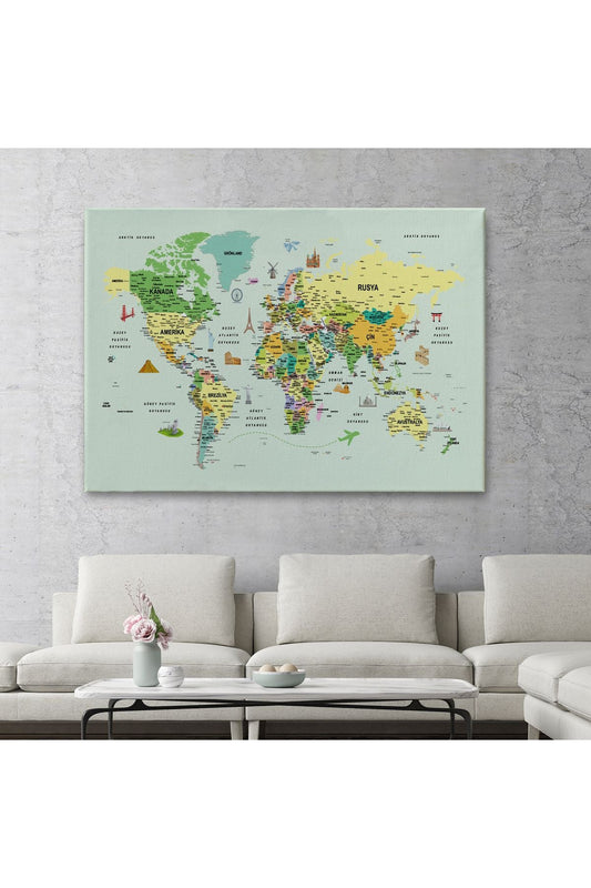 arg001 seri Türkçe Dünya Haritası Çok Detaylı Ünlü Yerler Sembollü Kanvas Tablo 1741