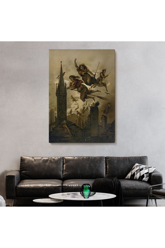Süpürgelerindeki Cadılar Evlerinin Çatılarının Üzerinden Uçuyor Duvar Tablosu-6118