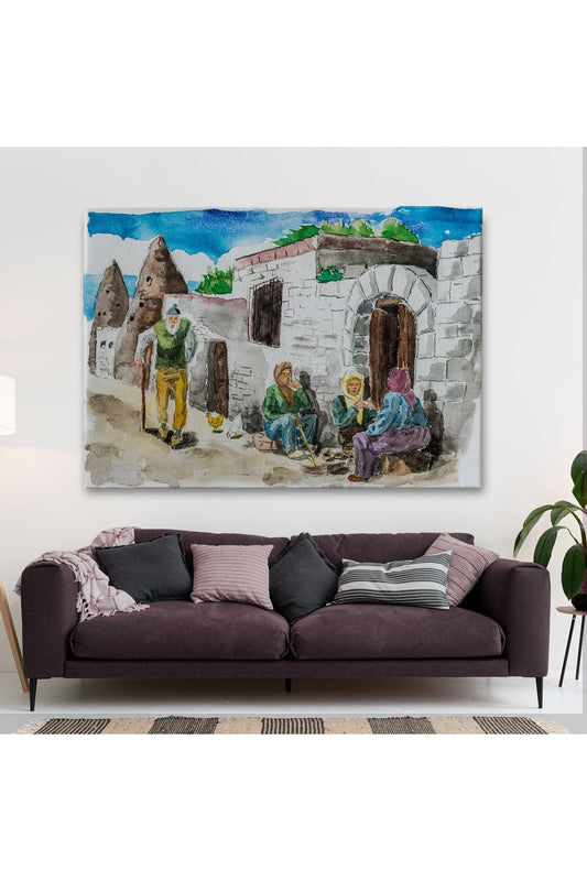 SZ KVS1-Kanvas Tablo-Kapadokya Göremedeki Köy Hayatı Yaşam Suluboya Görünüm 3756