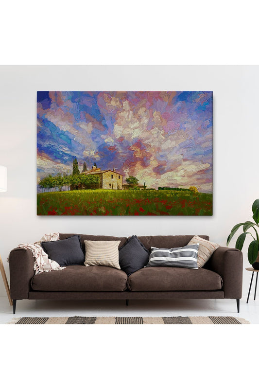 Toskana İtalyadaki Kırmızı Gelincik Tarlası Yağlıboya Görünüm Kanvas Tablosu-3697