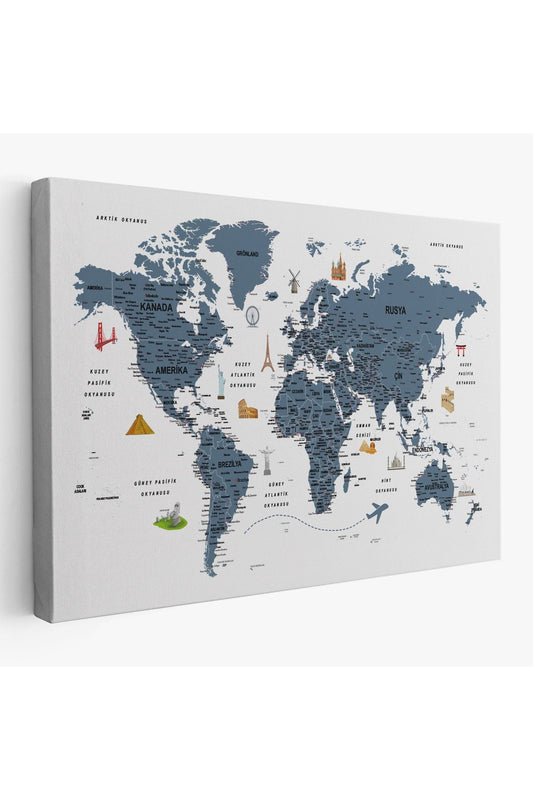 Türkçe Dünya Haritası Son Derece Ayrıntılı Eğitici ve Sembollü Kanvas Tablo 3206