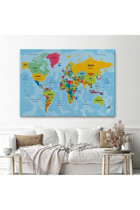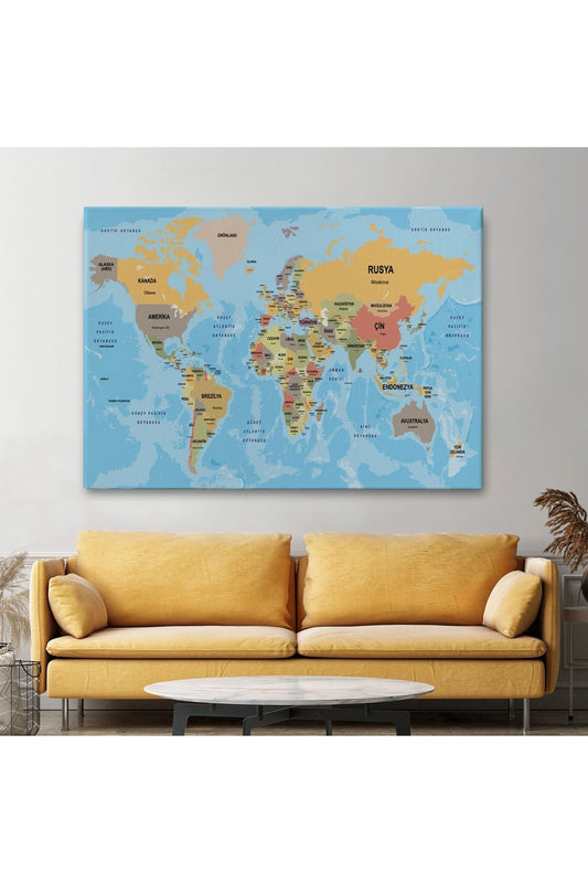 Türkçe Dünya Haritası Ülke Başkentli ve Okyanuslu Dekoratif Kanvas Tablo 2242