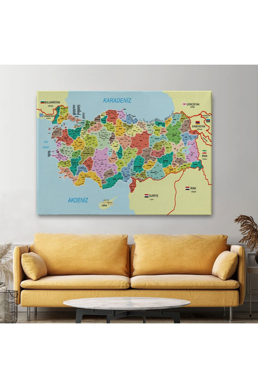 Türkiye Haritası Kanvas Tablo Sınır Komşulu Eğitici Dekoratif Tablo 3086
