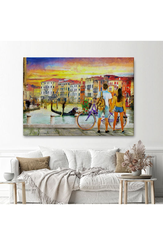 Venedik Kanalına Bakan Romantik Çift Yağlıboya Görünüm Kanvas Tablosu-3625