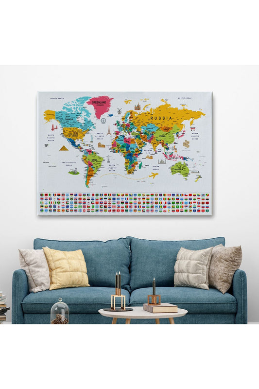 YB Dünya Haritası Ayrıntılı Eğitici Sembollü Bayraklı Dekoratif Kanvas Tablo 2867