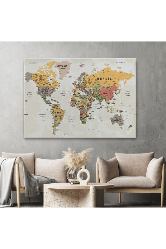 YB Dünya Haritası Son Derece Ayrıntılı Eğitici Okyanuslu Dekoratif Kanvas Tablo 2525