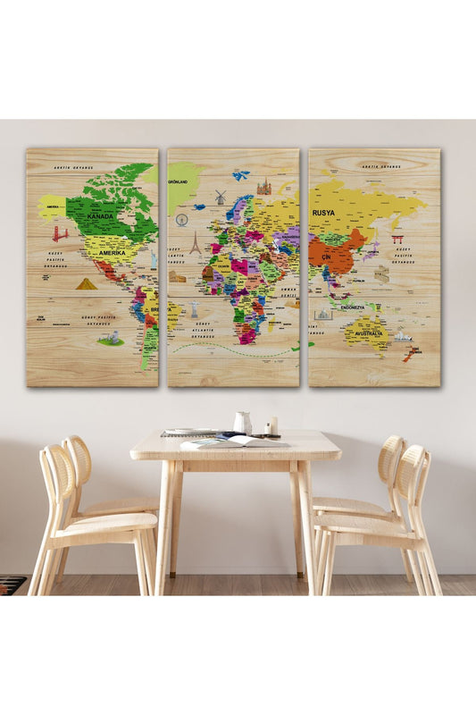 DB Ahşap Görünümlü Türkçe Dünya Haritası Sembollü Eğitici Dekoratif Kanvas Tablo 2911