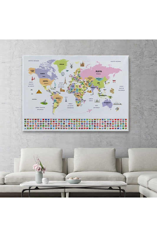 Dekoratif Duvar Tablosu-Ülke Başkentli Okyanuslu İngilizce Dünya Haritası Kanvas Tablo 2233