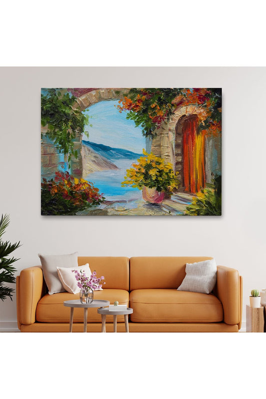 Dekoratif Duvar Tablosu-Deniz Manzaralı Ev ve Renkli Çiçekler Kanvas Tablo 3636