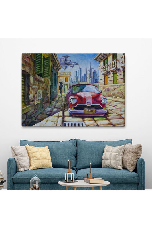 Dekoratif Kanvas Tablo, Duvar Tablosu-Yağlıboya Görünüm Eski Kırmızı Araba 3433
