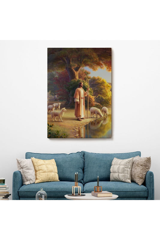 Dekoratif Kanvas Tablo-Hristiyan Duvar Sanatı, Kuzular ve Göl Kenarında İsa Mesih 5272