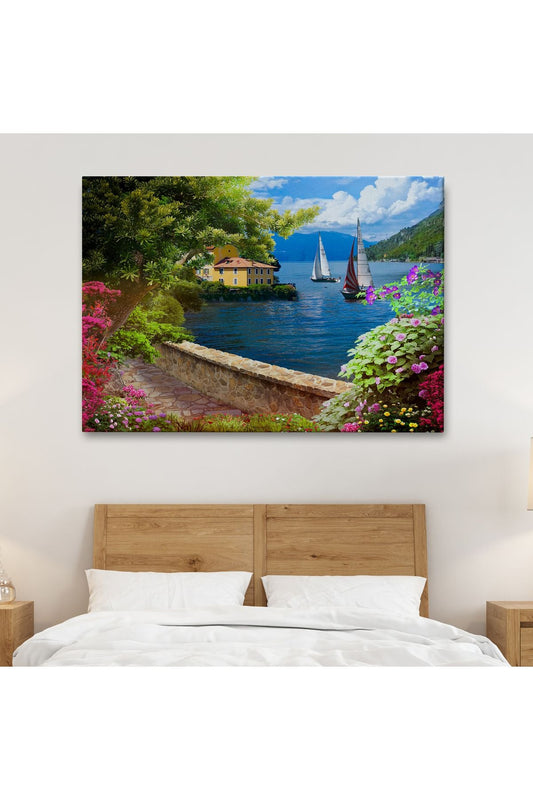Deniz Yakınında Ev, Renkli Çiçekler, Deniz Manzaralı Kanvas Duvar Tablosu-1111