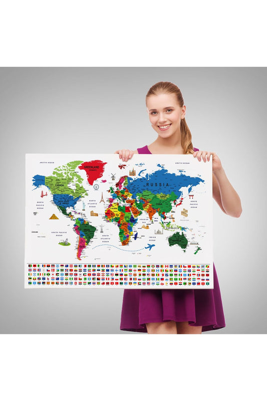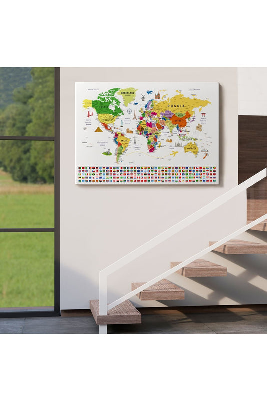 Dünya Haritası Ayrıntılı Eğitici Sembollü Bayraklı Dekoratif Kanvas Tablo 2839