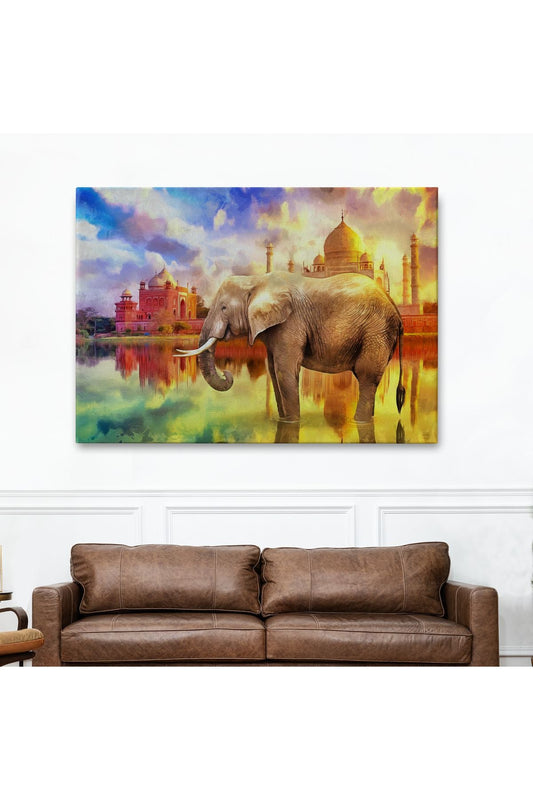 Fil ve Taç Mahal Manzaralı Yağlıboya Görünüm Dekoratif Kanvas Duvar Tablosu-3716