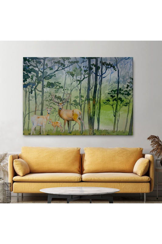 Geyik Ailesi Suluboya Görünüm Dekoratif Kanvas Duvar Tablosu-3648