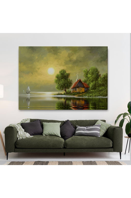 Göl Manzaralı Köy Evi Yağlıboya Görünüm Dekoratif Kanvas Duvar Tablosu-3510