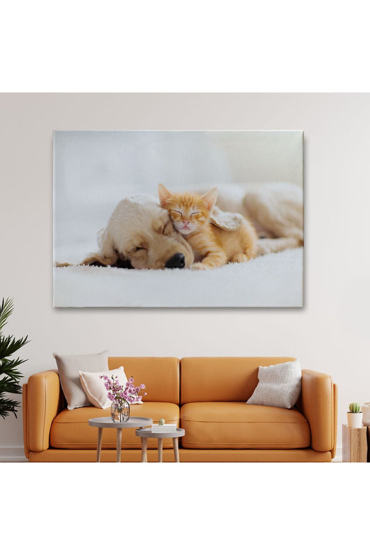 Golden Köpek İle Uyuyan Yavru Kedi Dekoratif Kanvas Tablo 1176