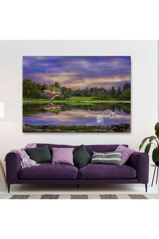Göl Kenarındaki Köy Evi Yağlıboya Görünüm Dekoratif Kanvas Duvar Tablosu-3592