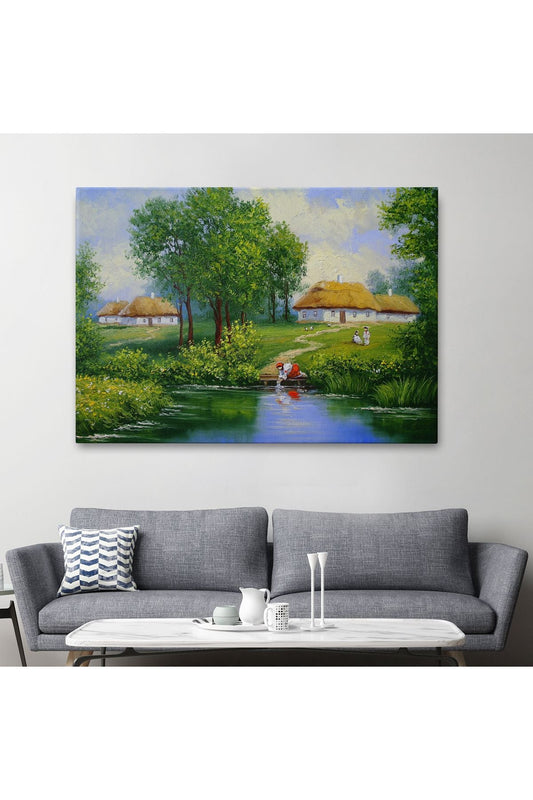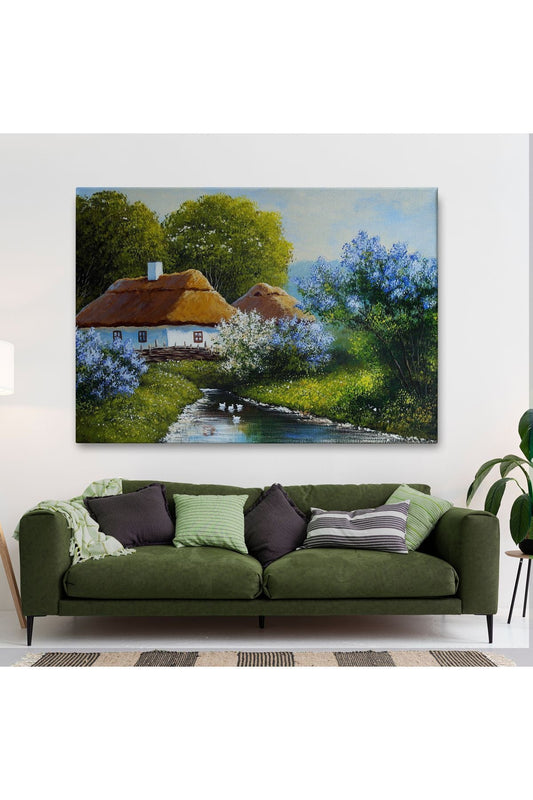 Akarsu Kenarındaki Köy Evi Yağlıboya Dekoratif Kanvas Duvar Tablosu-3637