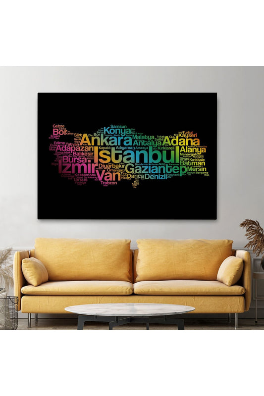 İller İsimli Siyah Zeminli Dekoratif Kanvas Tablo 1016