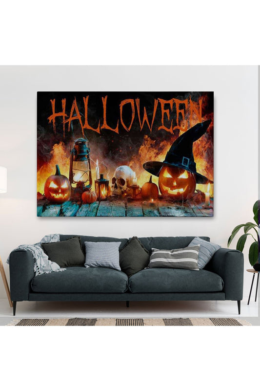İskelet Kafa ve Oymalı Kabaklar Cadılar Bayramı Dekoratif Duvar Tablosu-5198