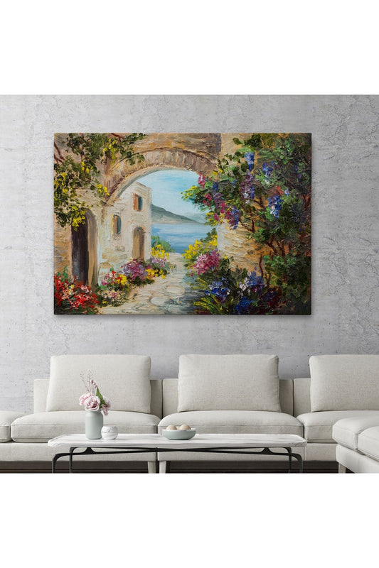 Deniz Yakınında Ev, Renkli Çiçekler, Deniz Manzaralı Kanvas Duvar Tablosu-1111