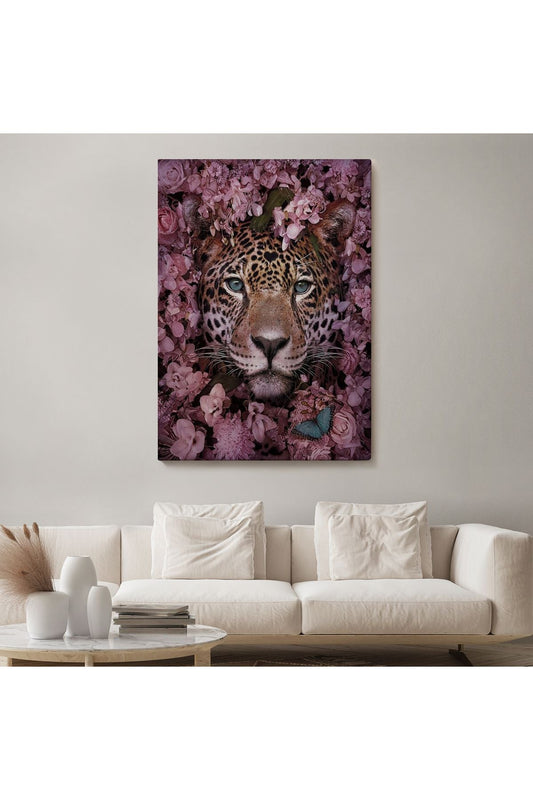 Pembe Çiçekler Arasında Vahşi Leopar Dekoratif Duvar Tablosu-6195