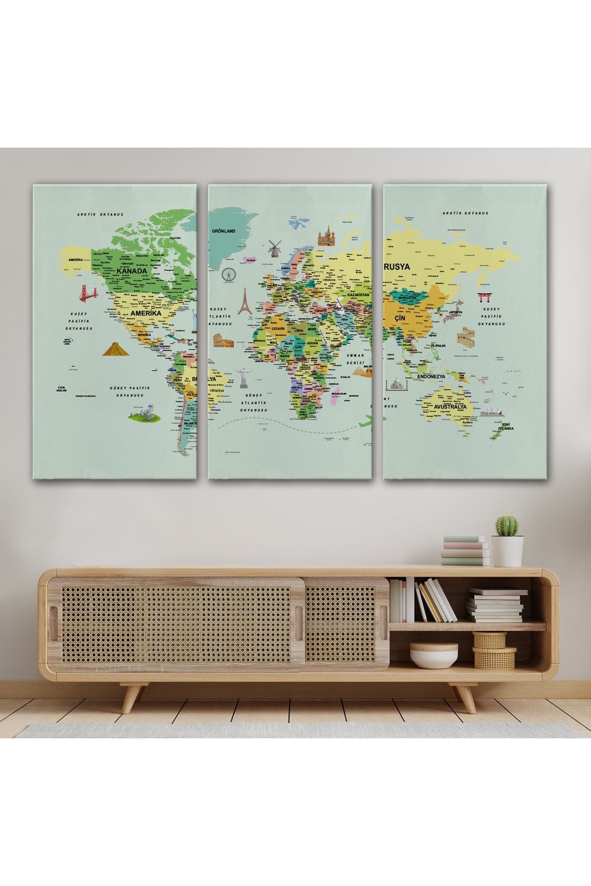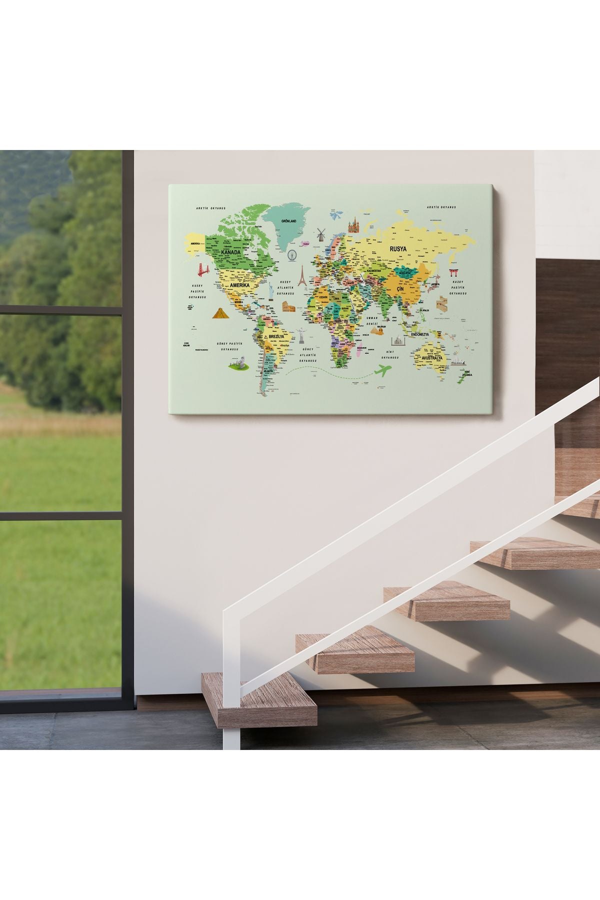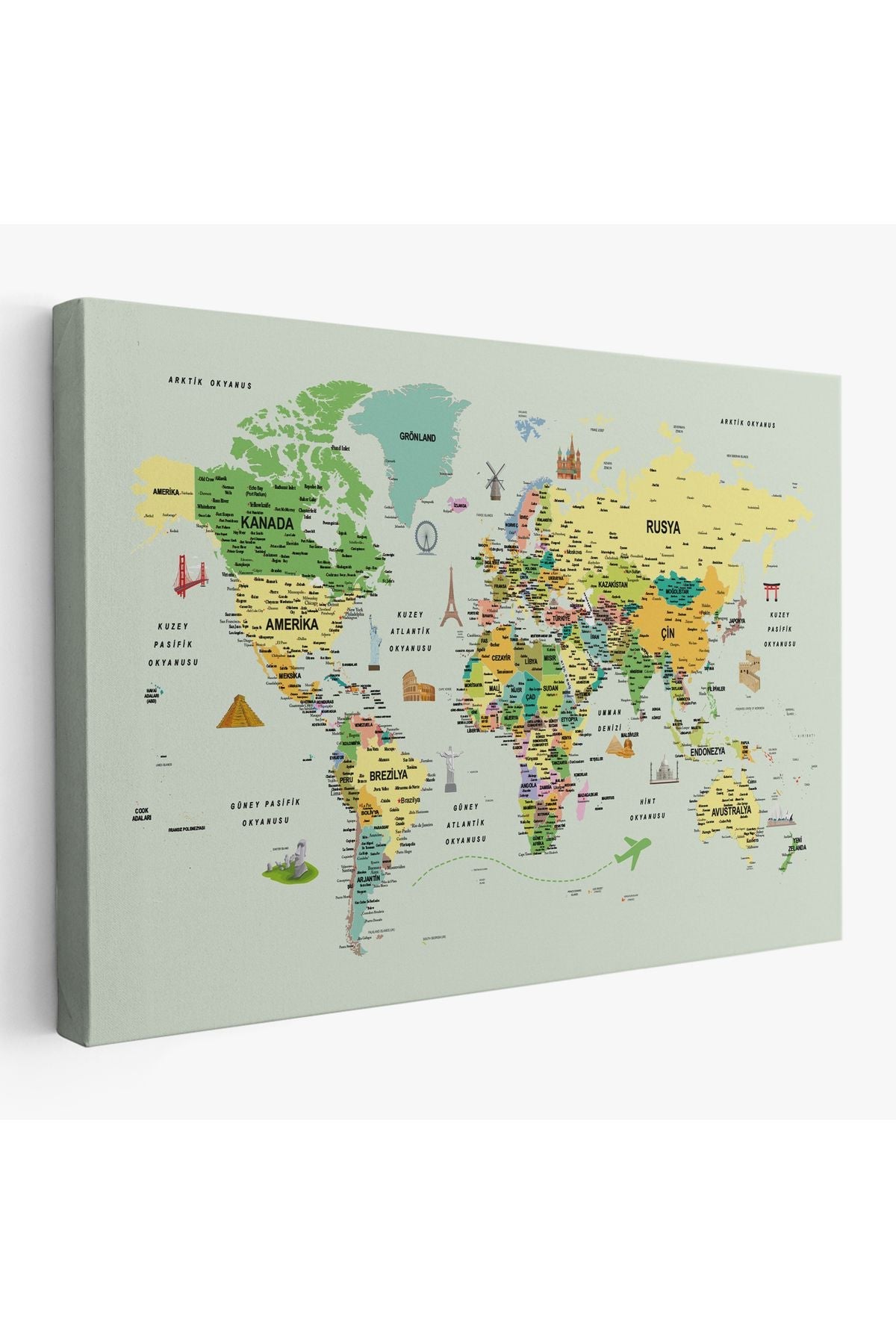 arg001 seri Türkçe Dünya Haritası Çok Detaylı Ünlü Yerler Sembollü Kanvas Tablo 1741
