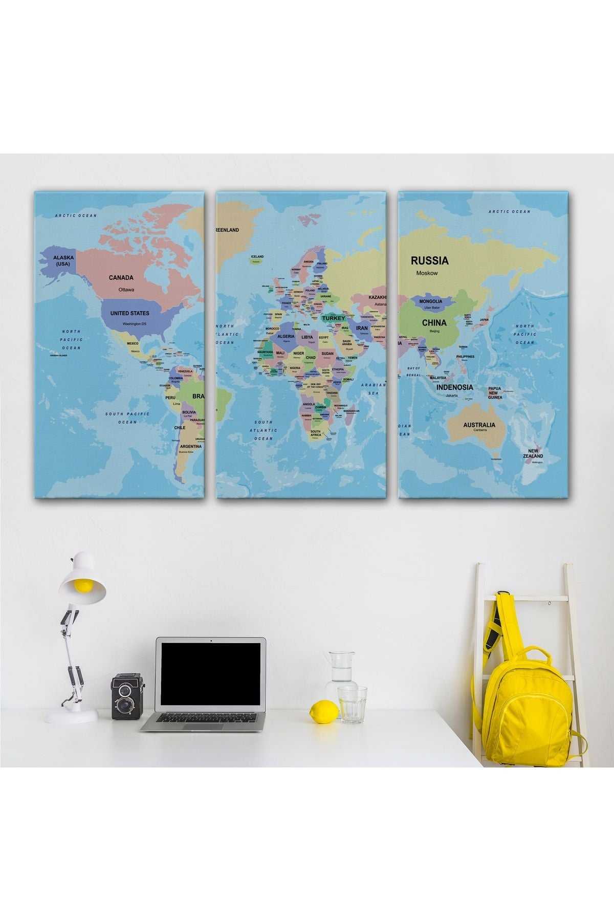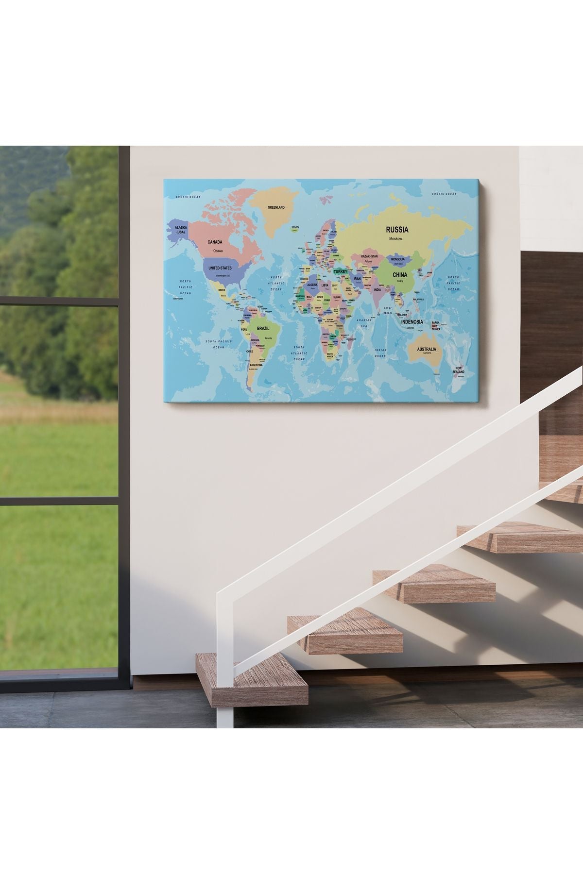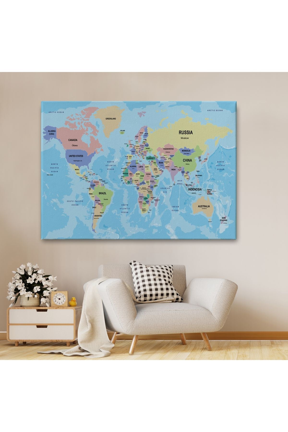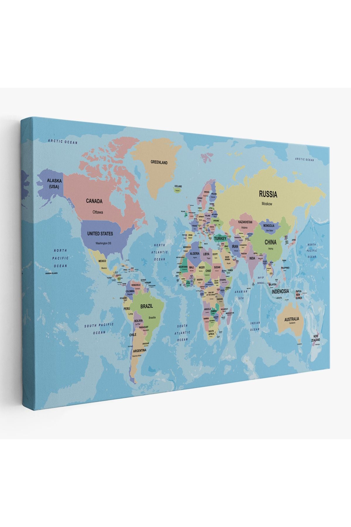 Dekoratif Duvar Tablosu-Ülke Başkentli Okyanuslu İngilizce Dünya Haritası Kanvas Tablo 2233
