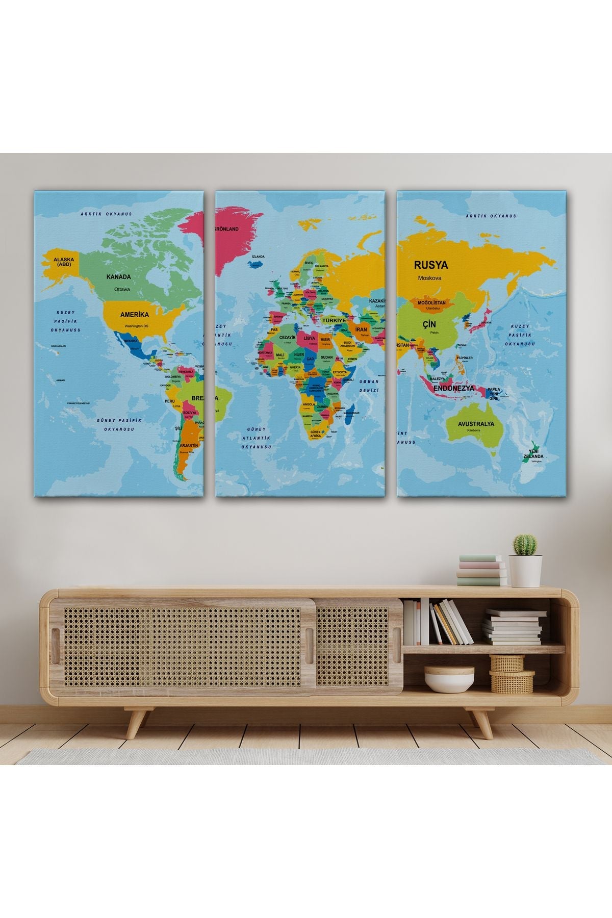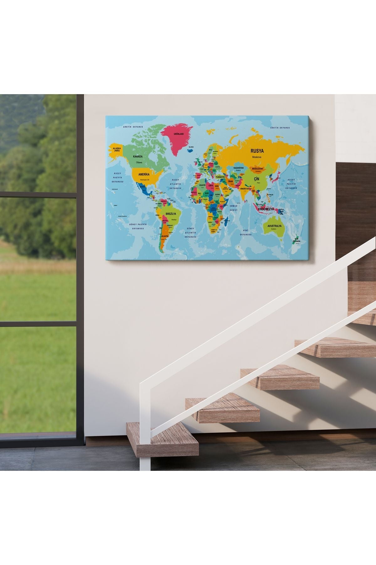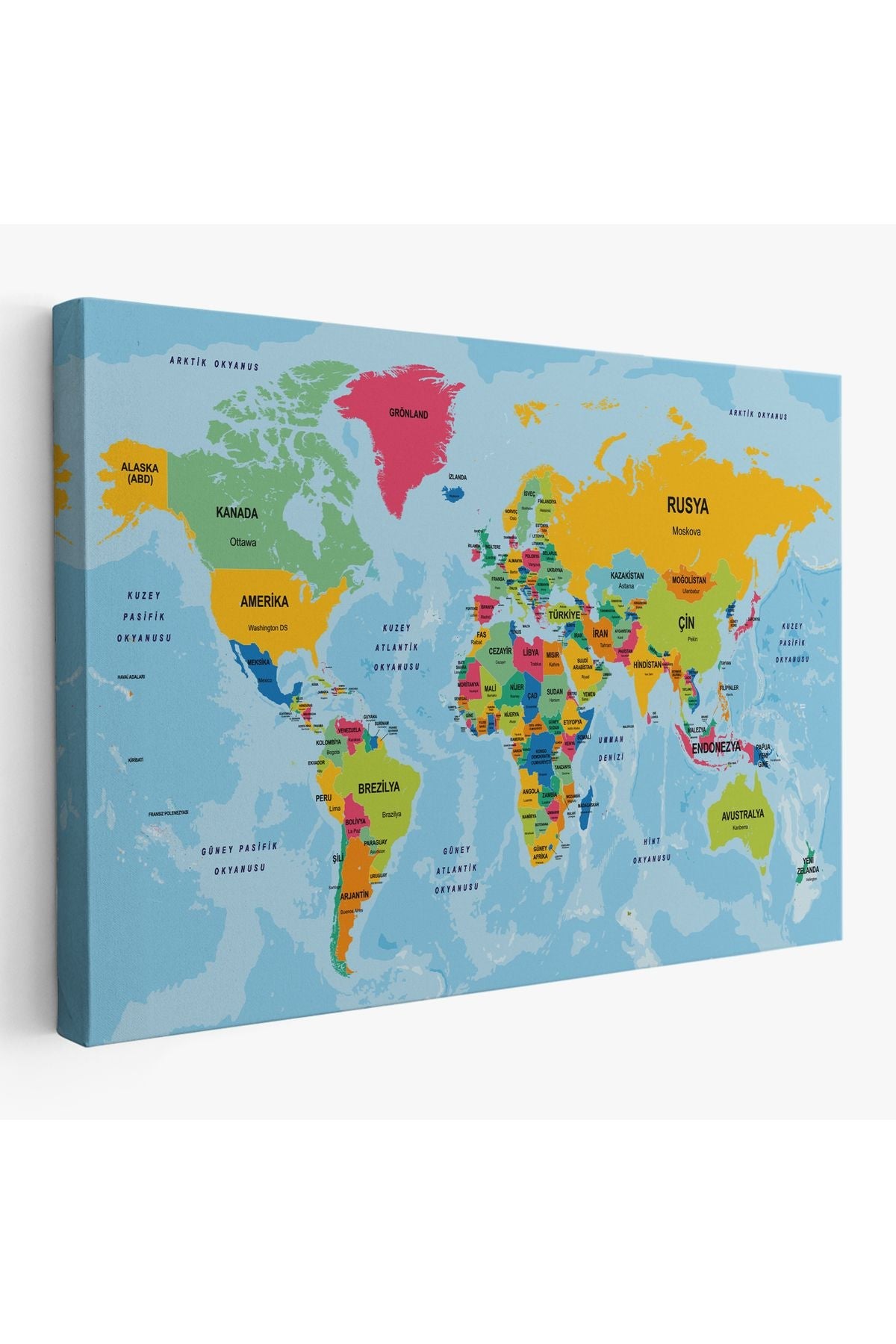 Türkçe Dünya Haritası Ülke Başkentli ve Okyanuslu Dekoratif Kanvas Tablo 2242