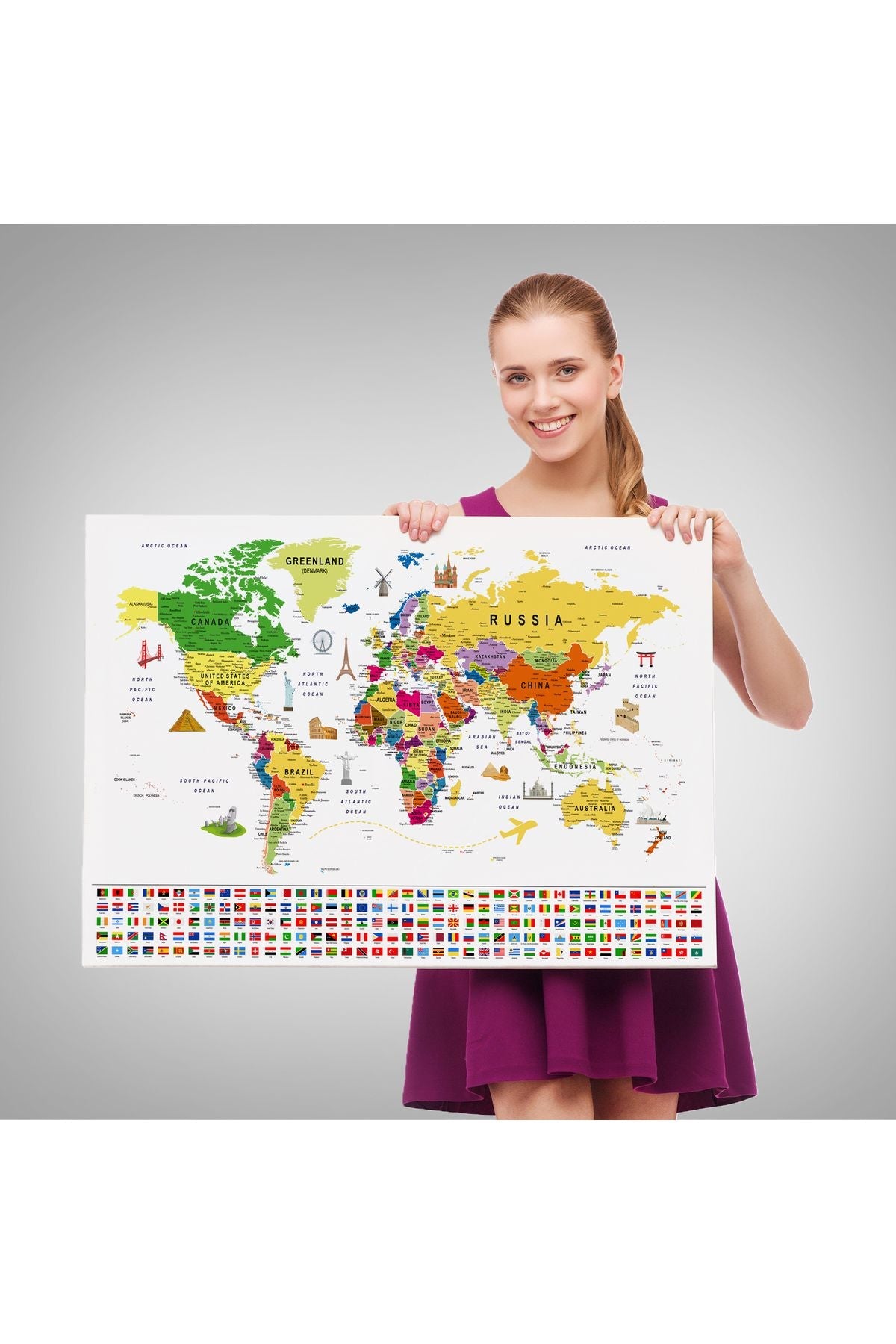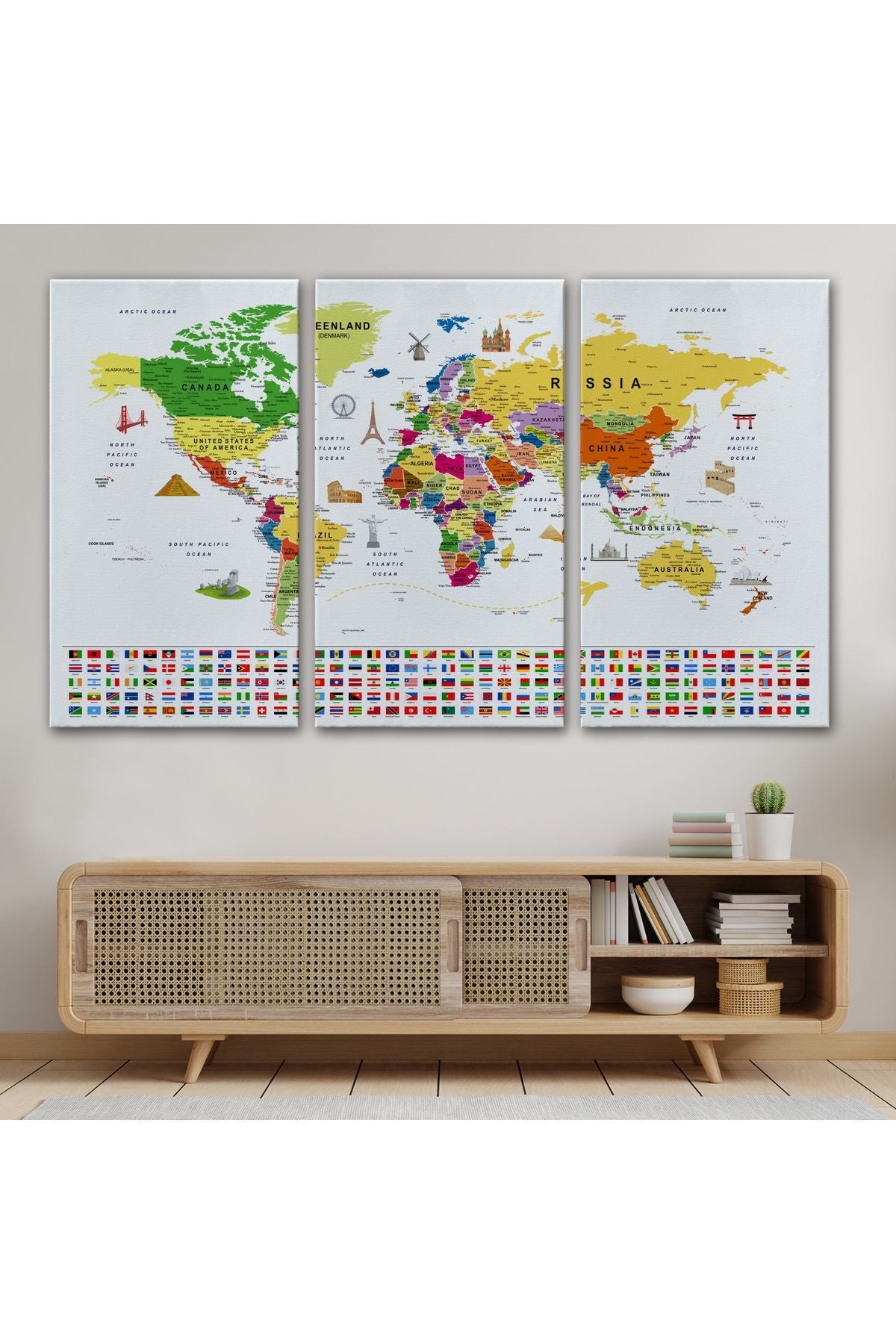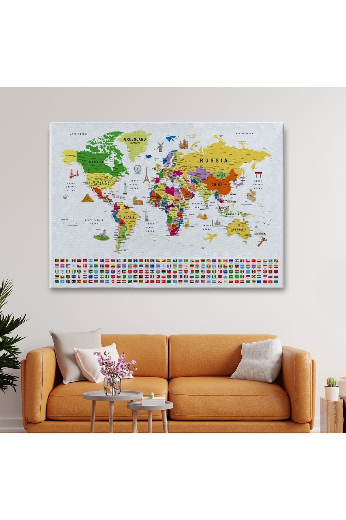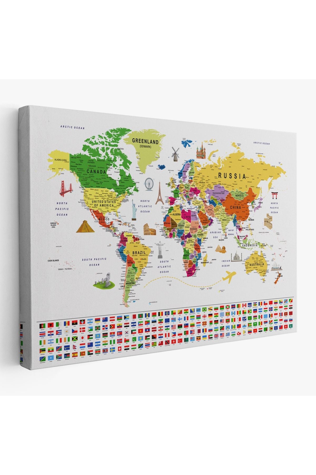 Dünya Haritası Ayrıntılı Eğitici Sembollü Bayraklı Dekoratif Kanvas Tablo 2839