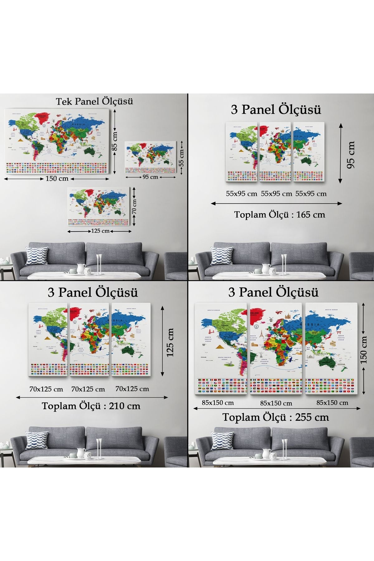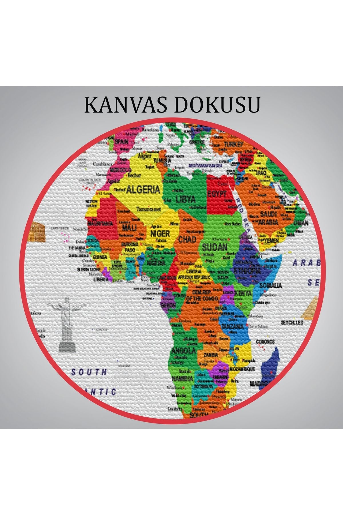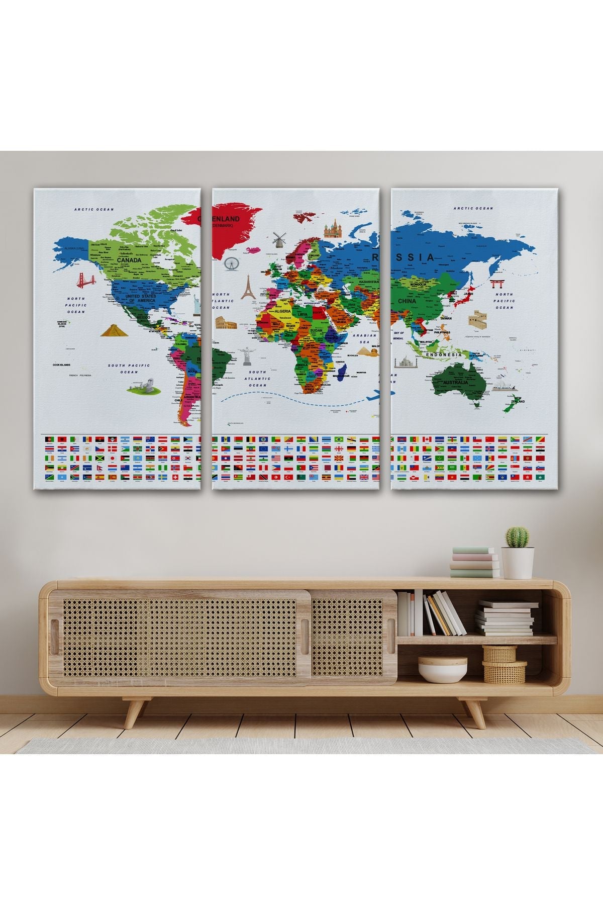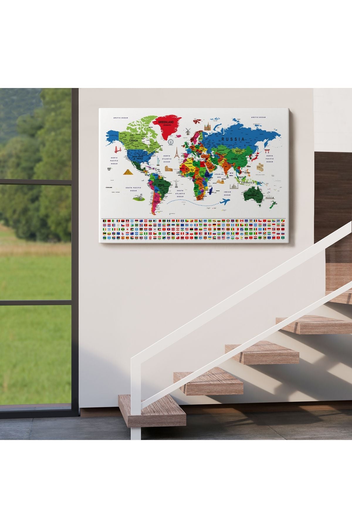 Dünya Haritası Ayrıntılı Eğitici Sembollü Bayraklı Dekoratif Kanvas Tablo 2881