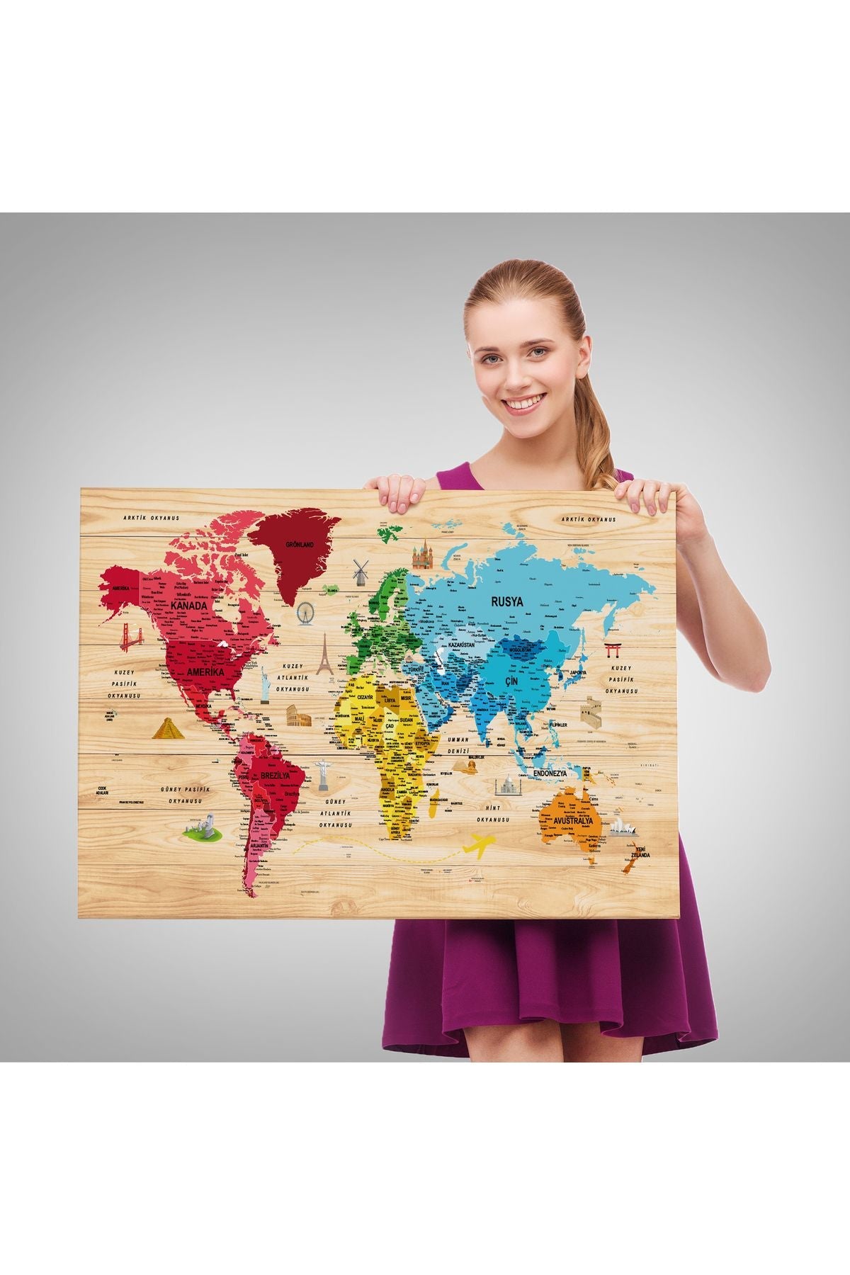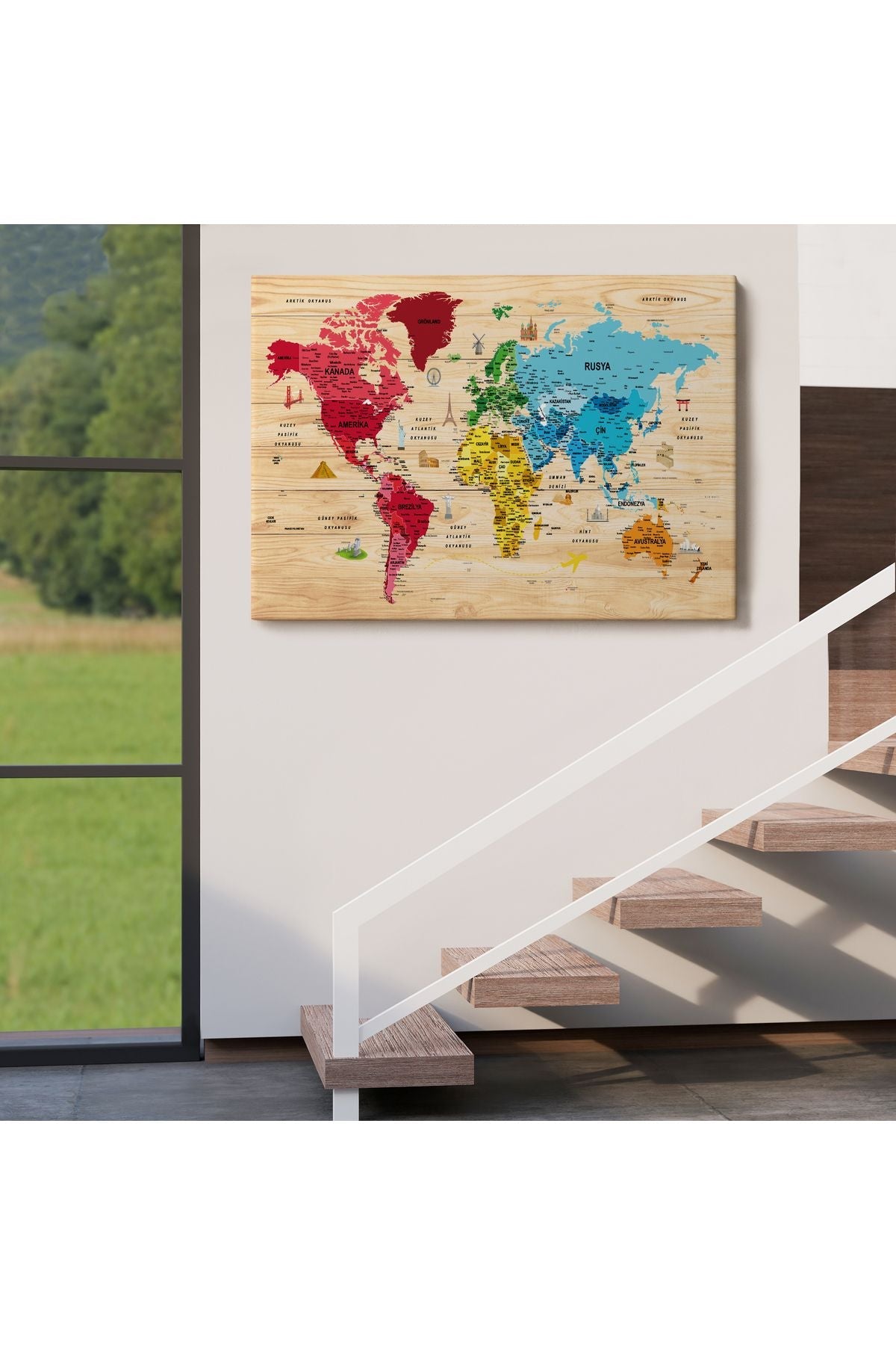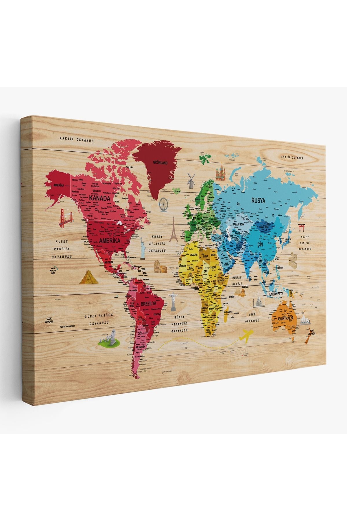 Ahşap Görünümlü Türkçe Dünya Haritası Sembollü Eğitici Kanvas Tablo 2949