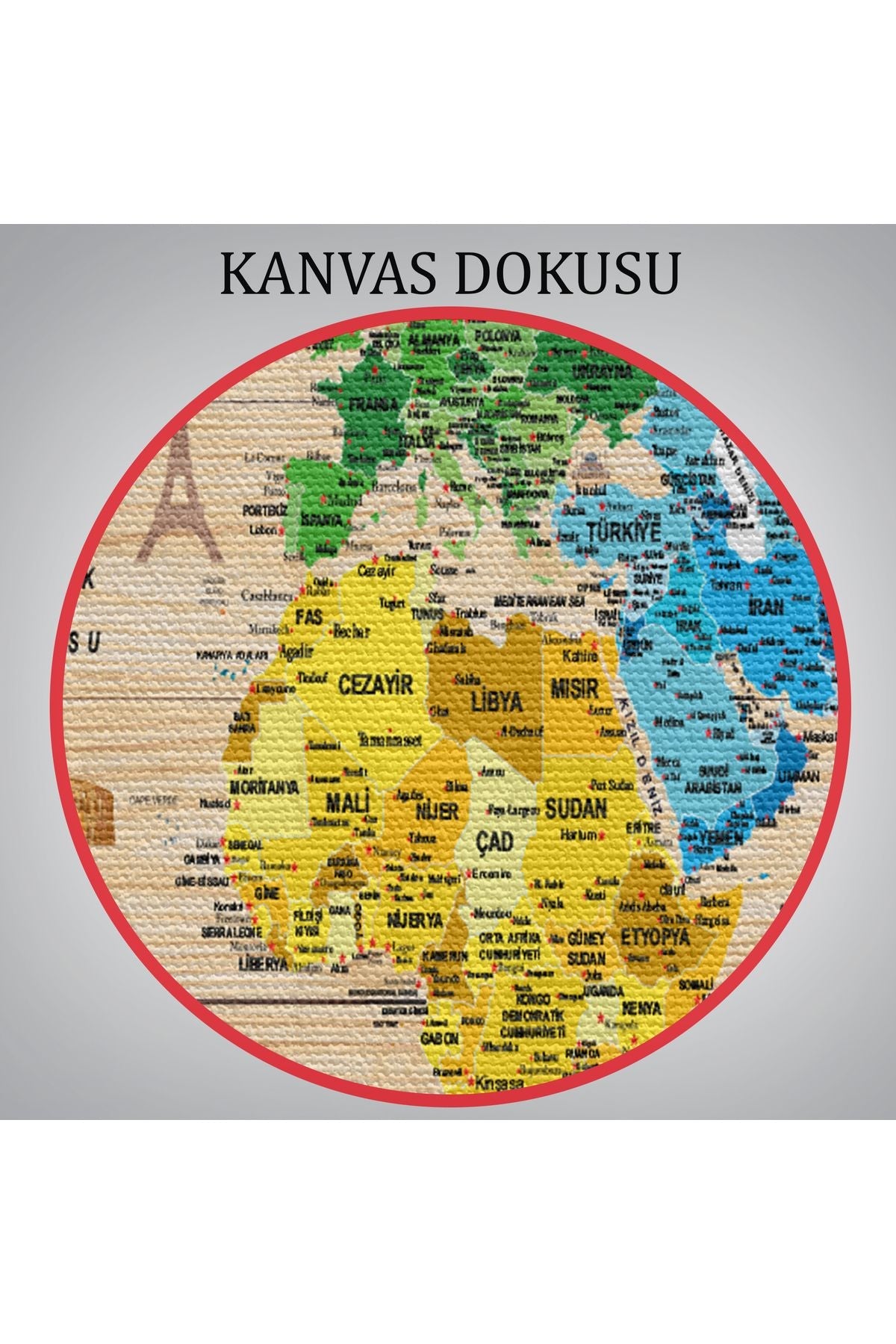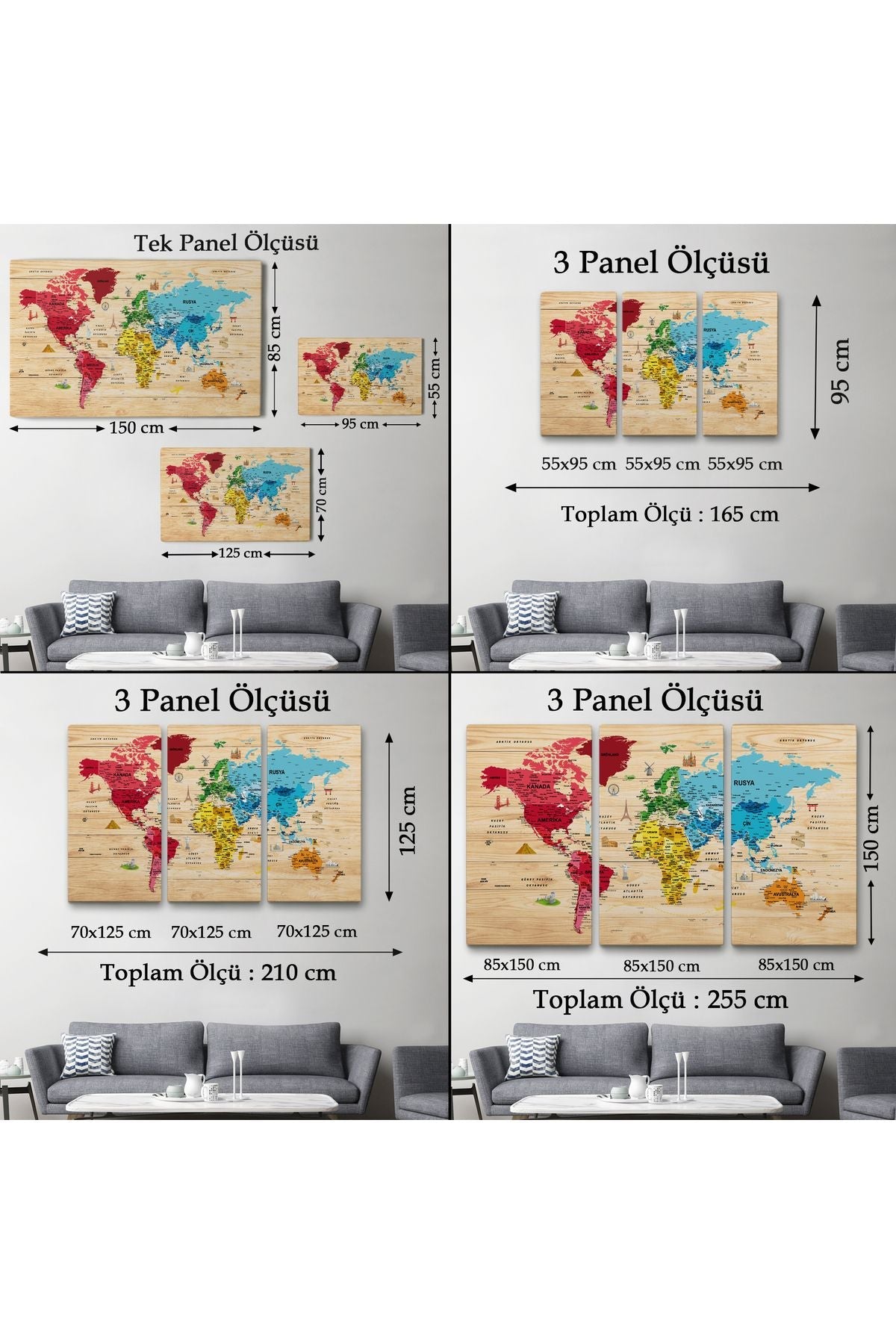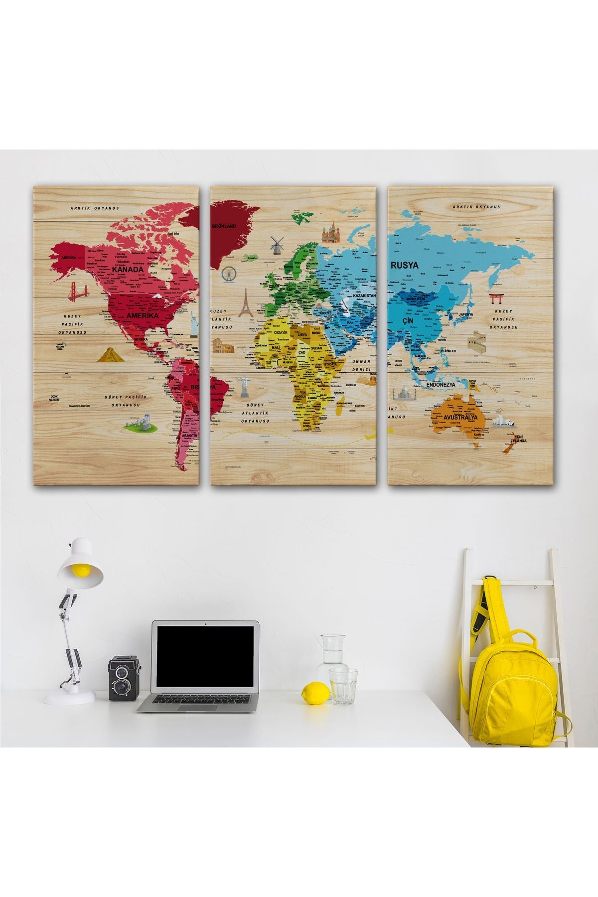 Ahşap Görünümlü Türkçe Dünya Haritası Sembollü Eğitici Kanvas Tablo 2949