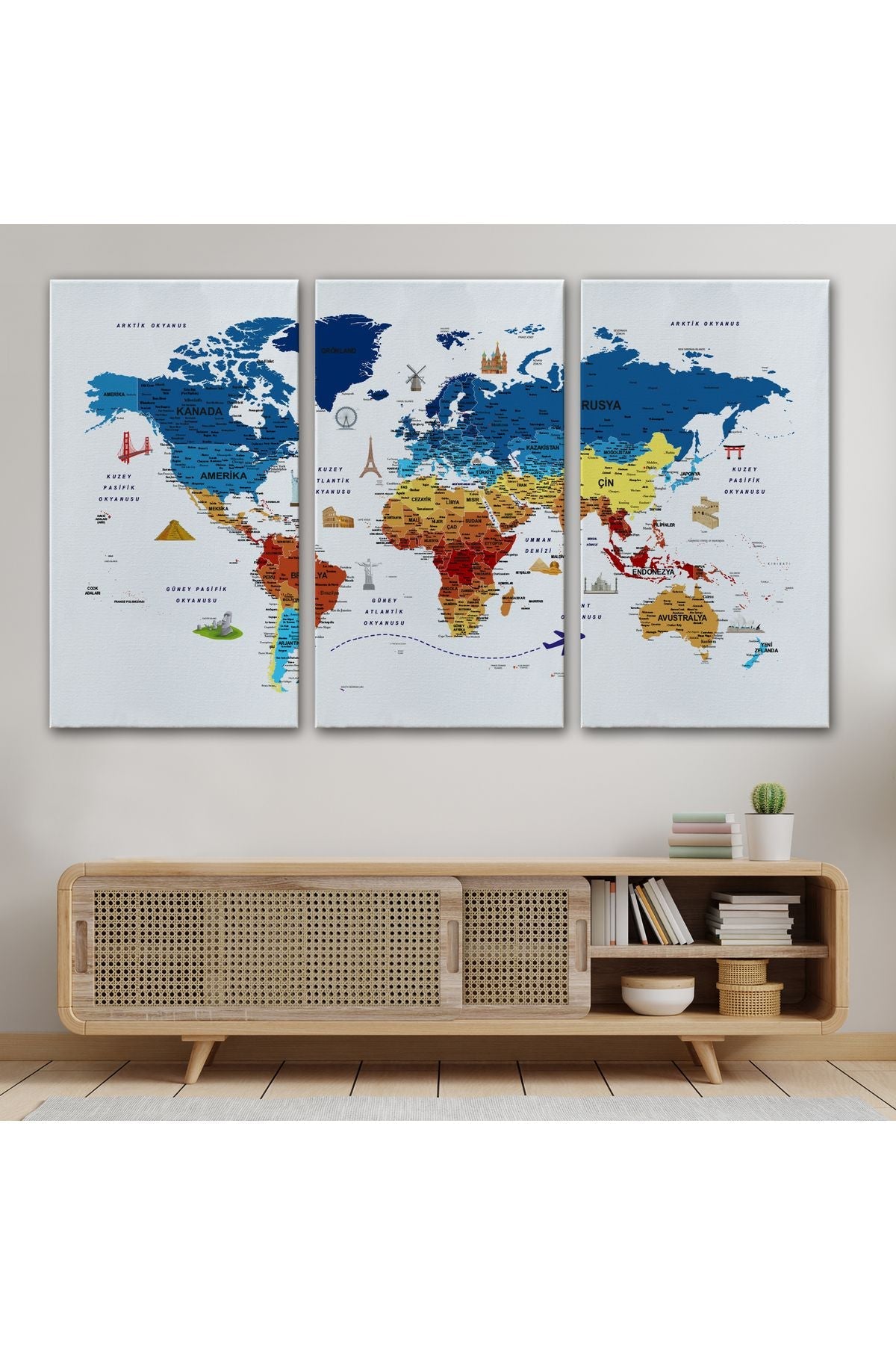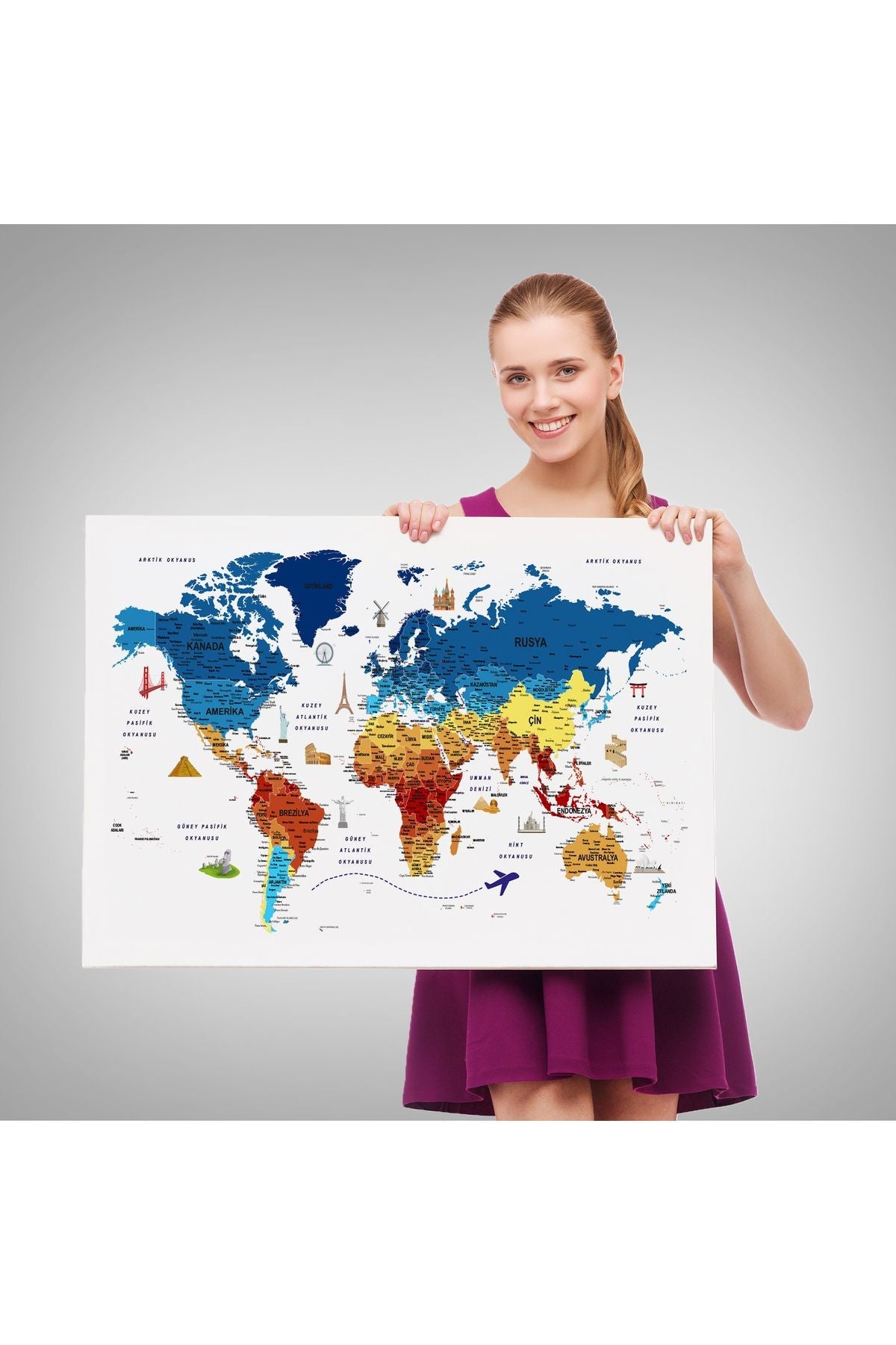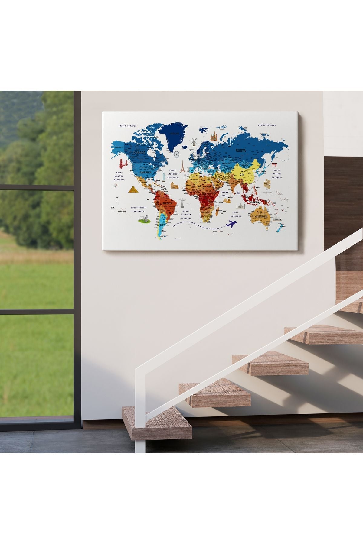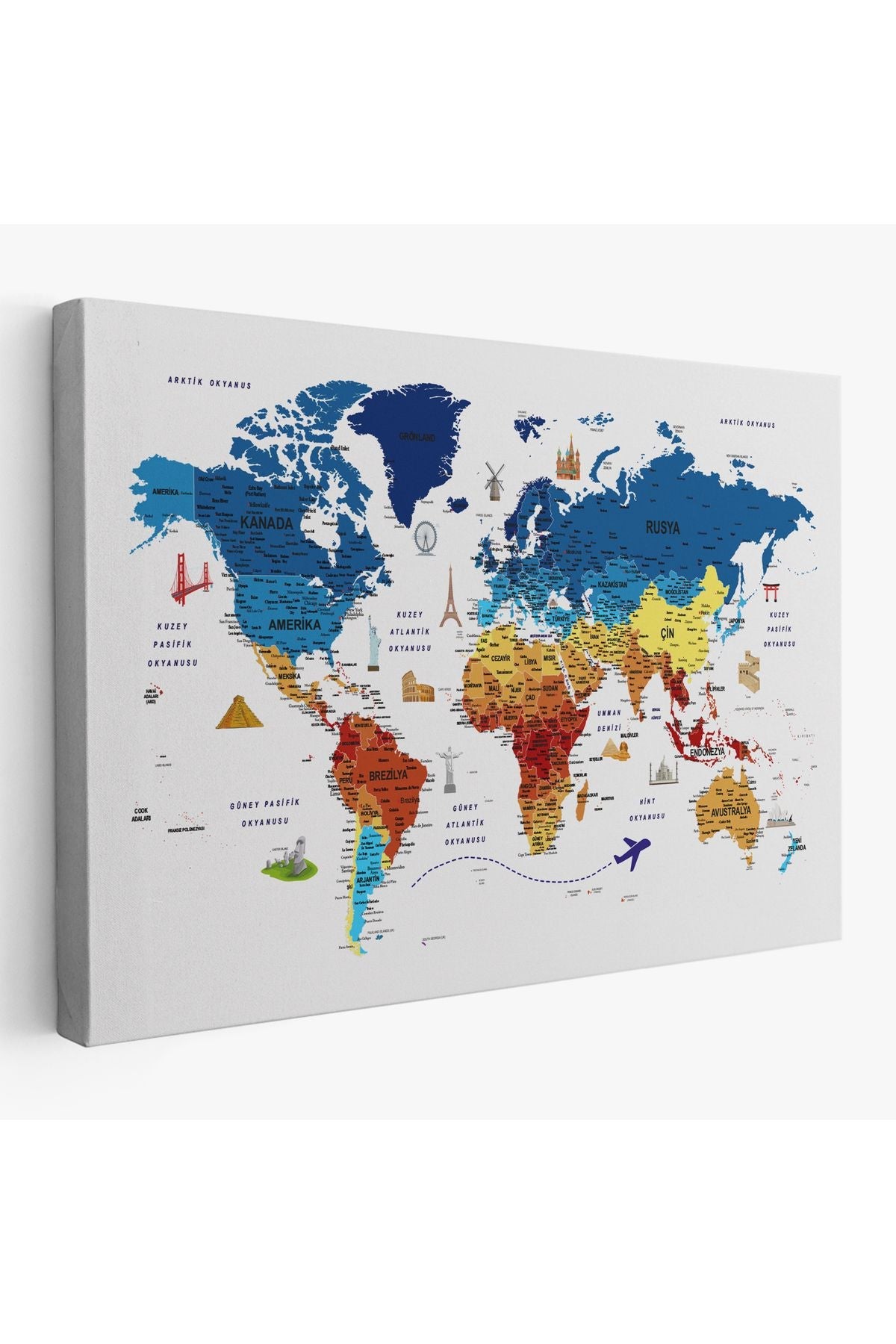 Türkçe Dünya Haritası Son Derece Ayrıntılı Eğitici ve Sembollü Kanvas Tablo 3166