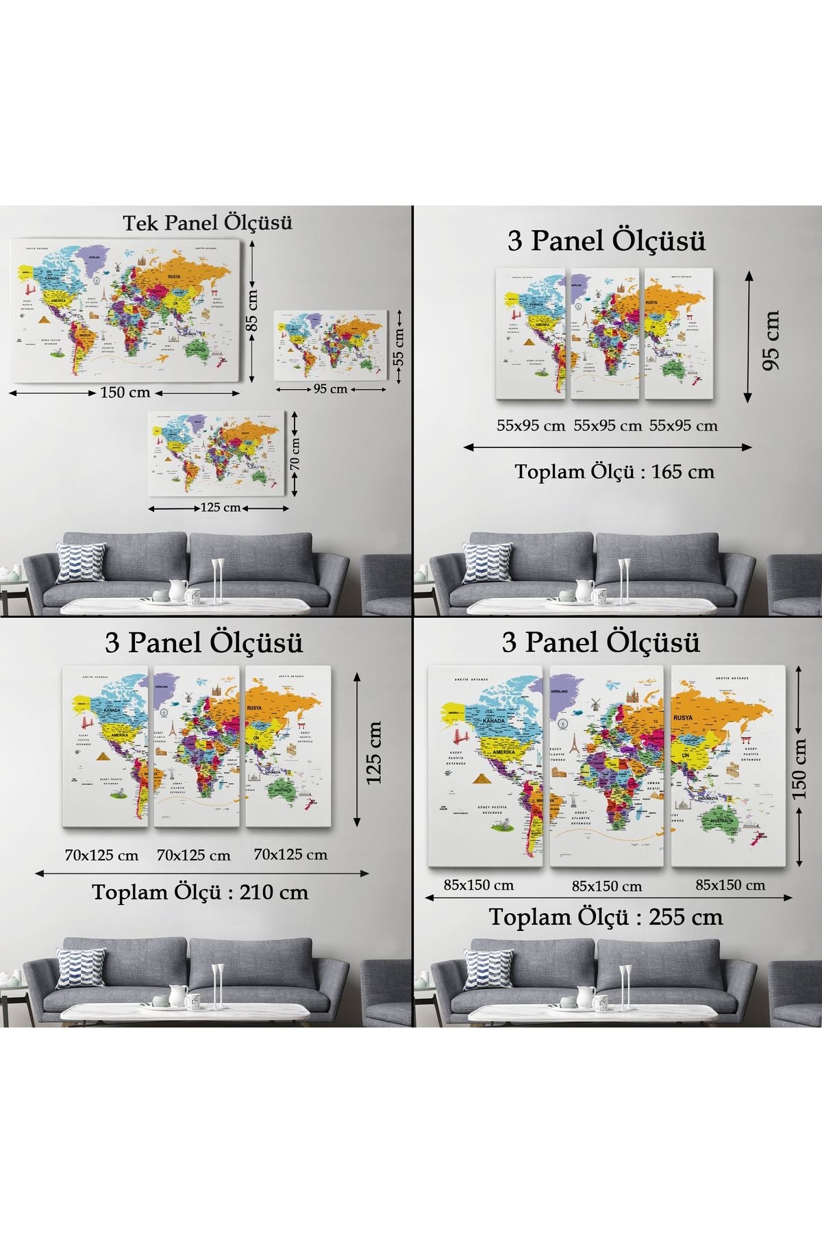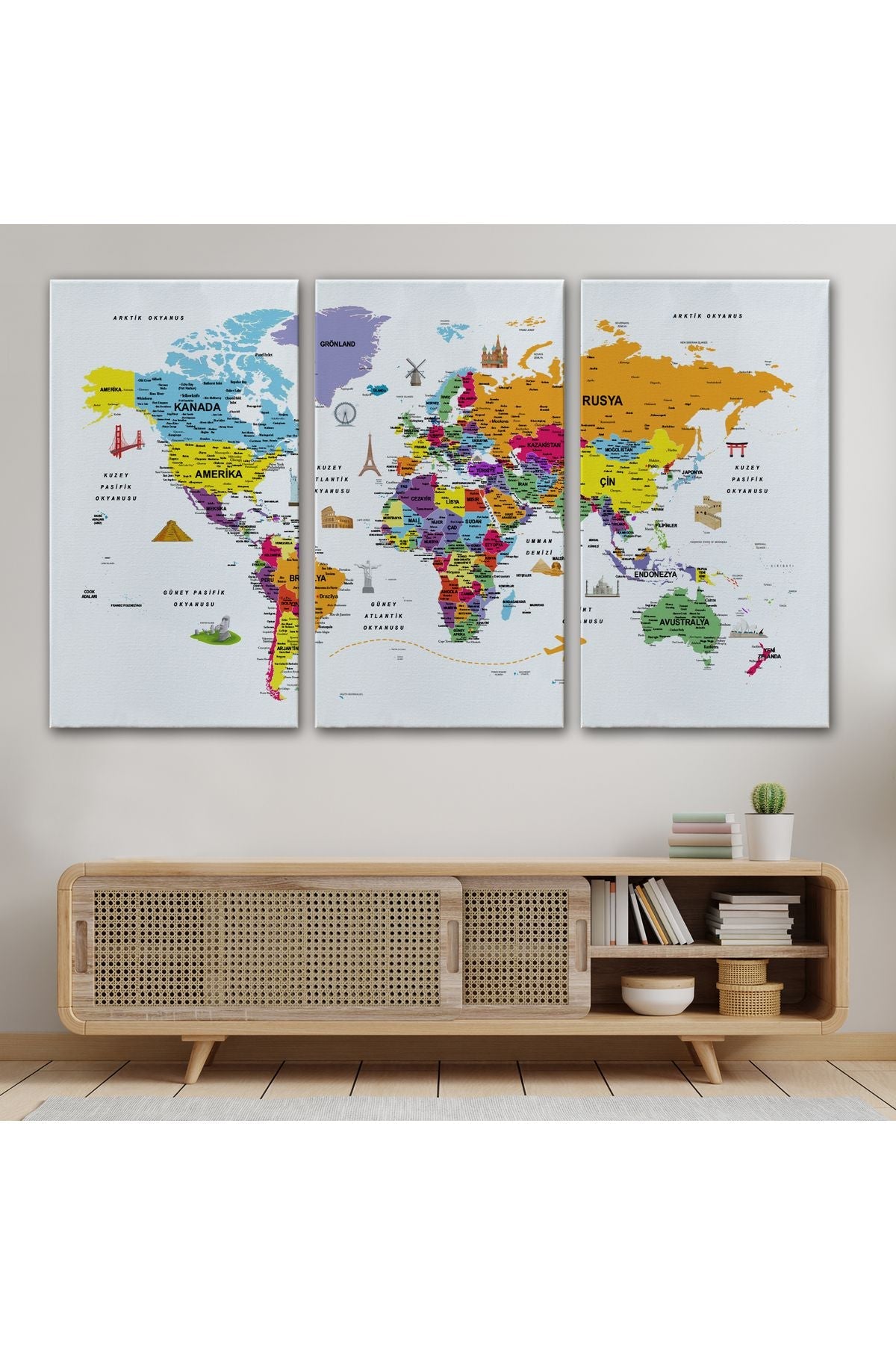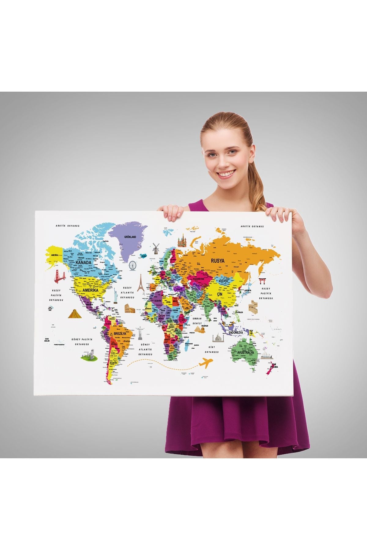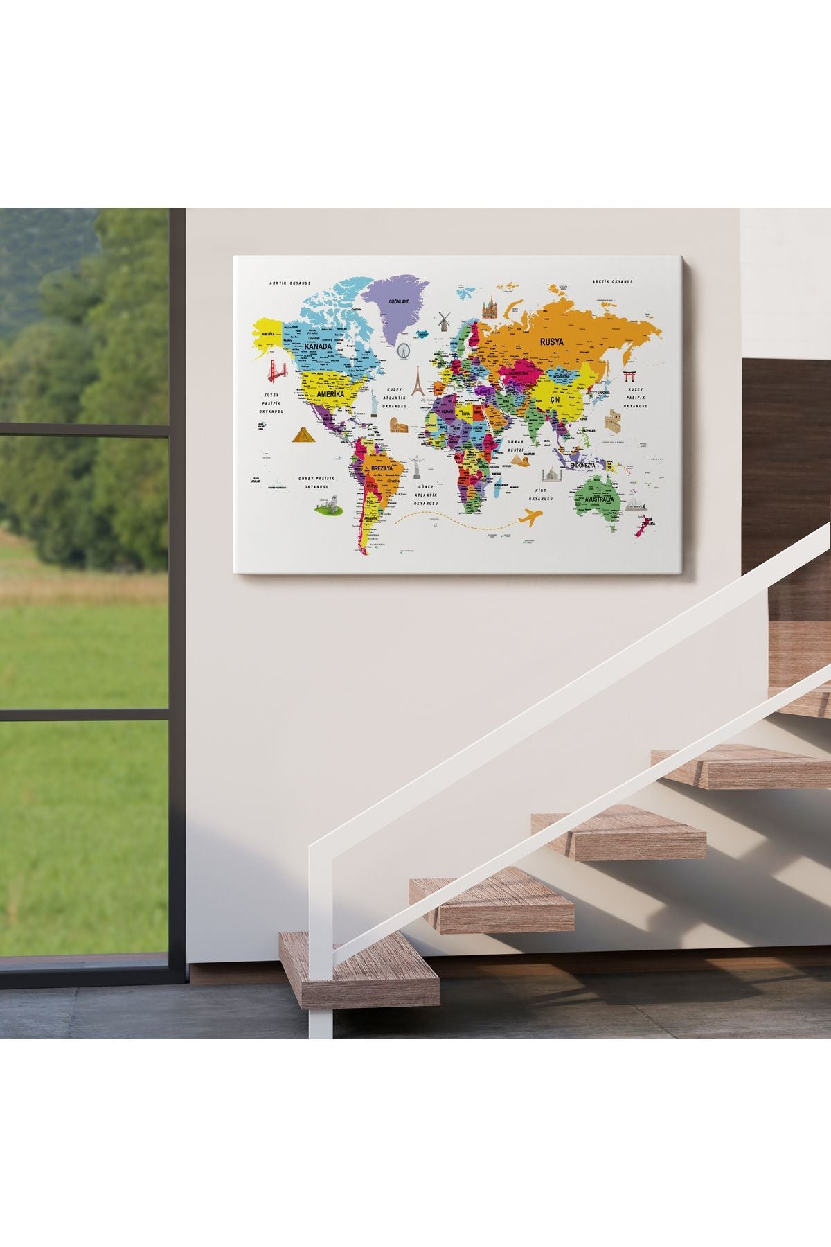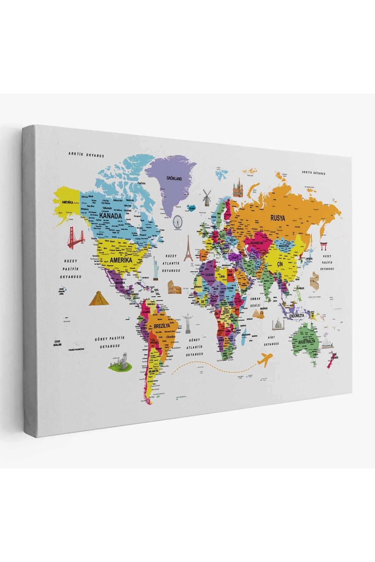 HG Türkçe Dünya Haritası Son Derece Ayrıntılı Eğitici ve Sembollü Kanvas Tablo 3180