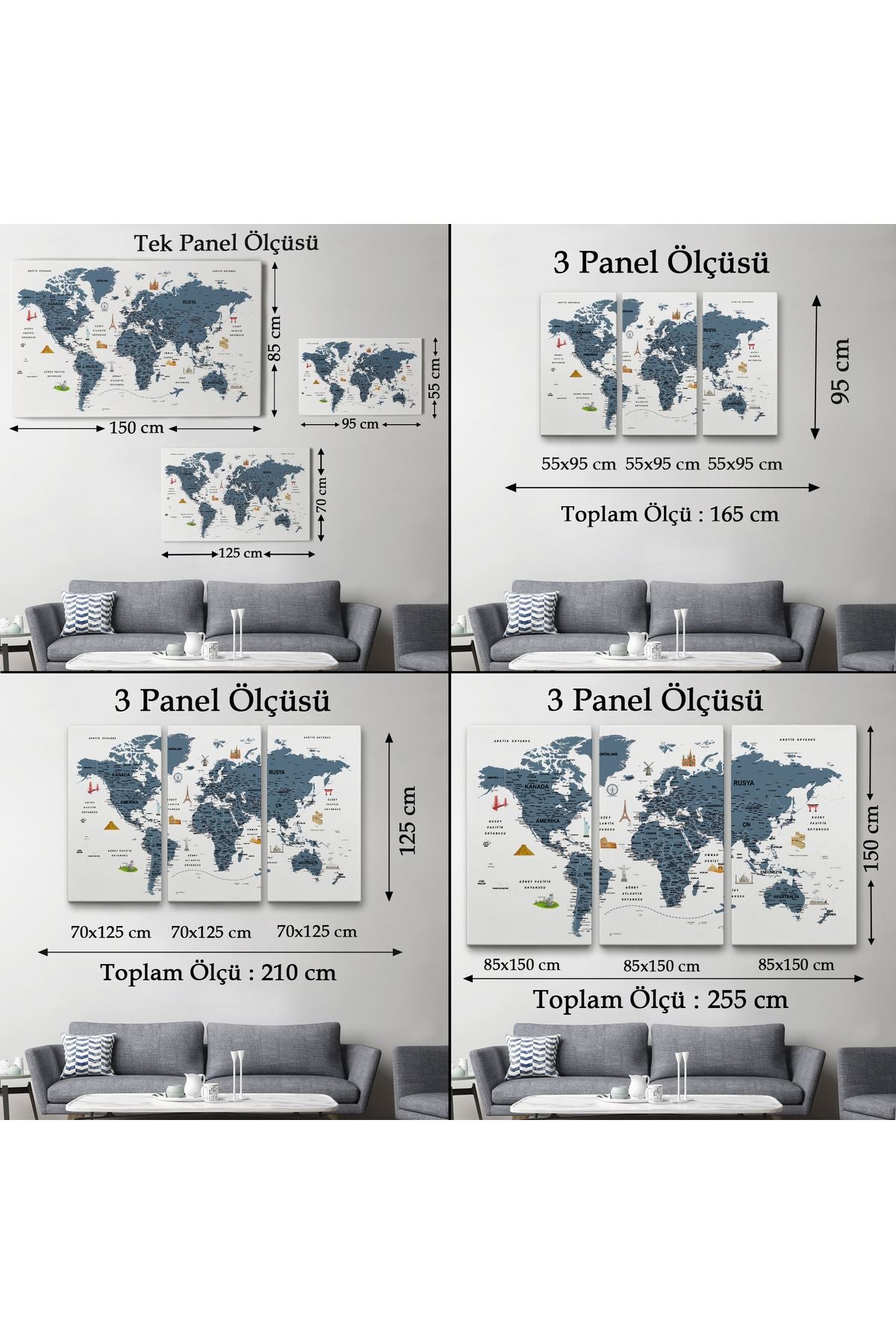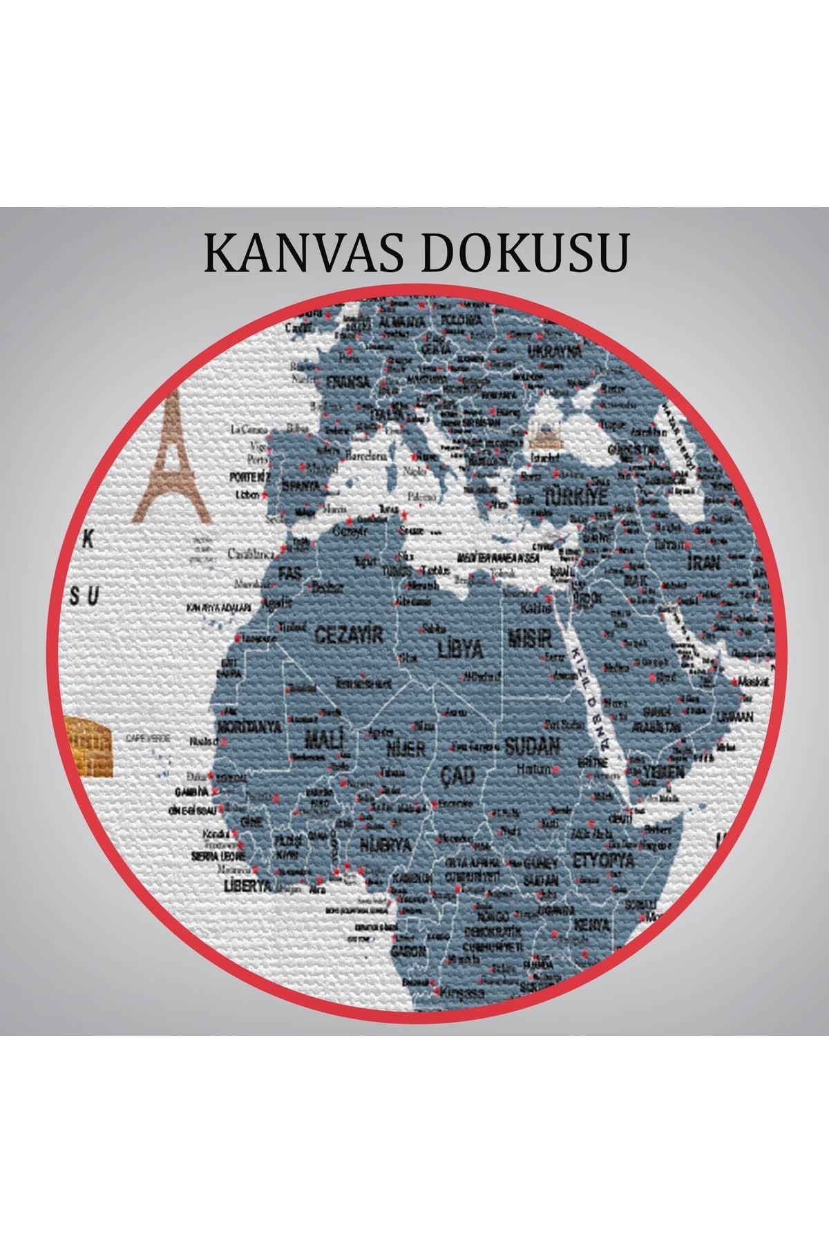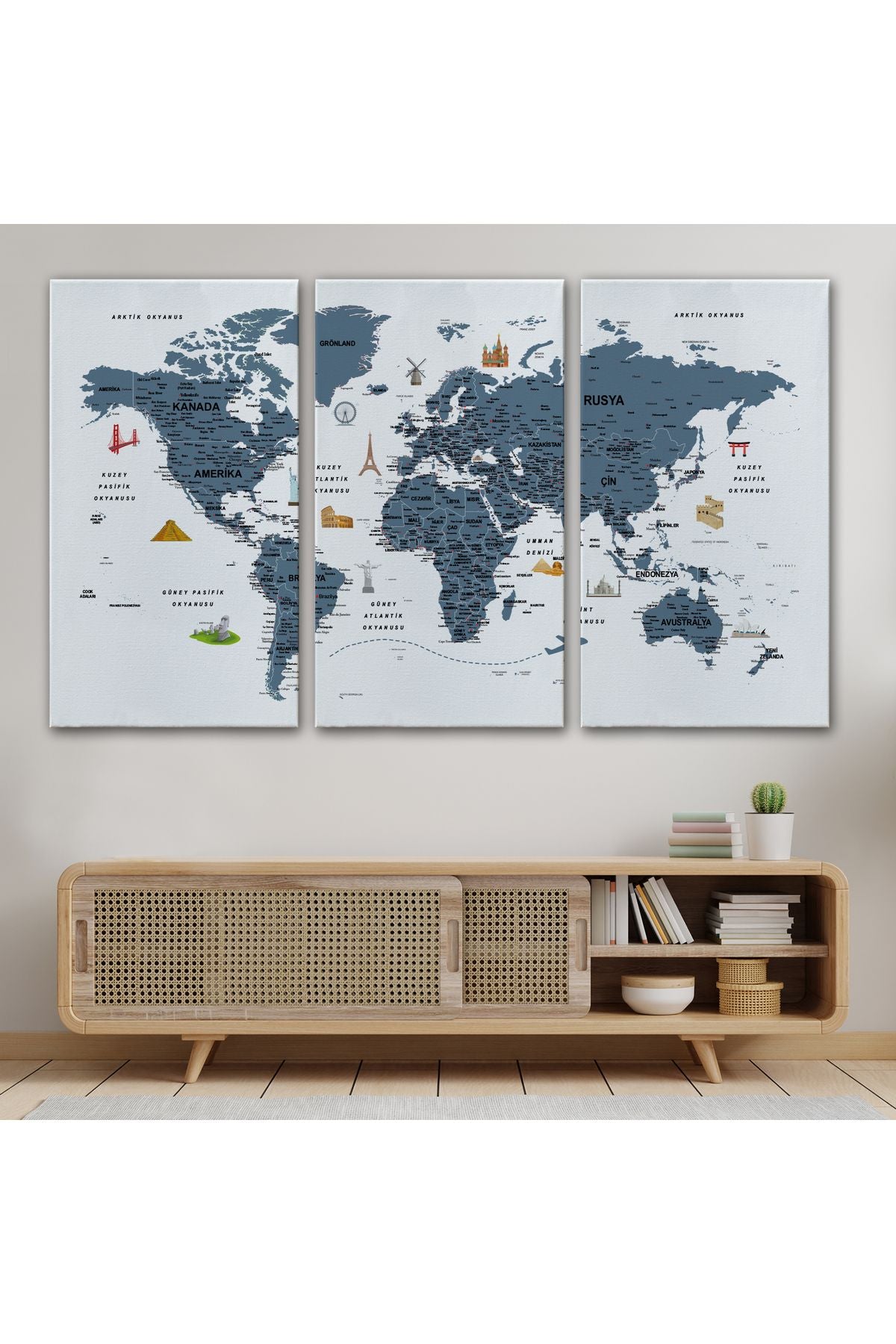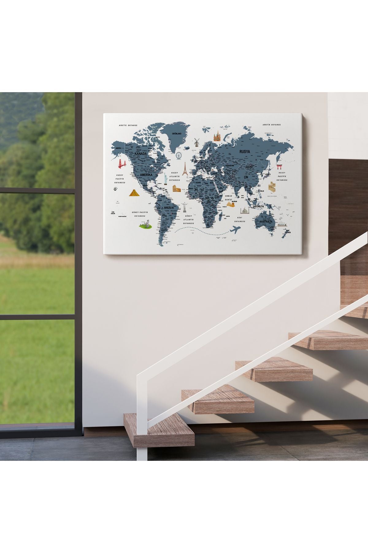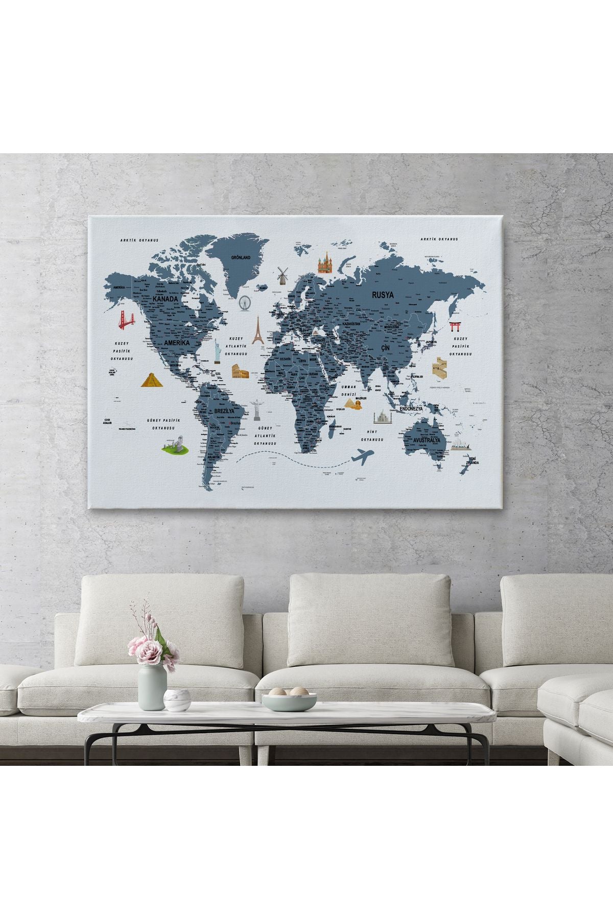 Türkçe Dünya Haritası Son Derece Ayrıntılı Eğitici ve Sembollü Kanvas Tablo 3188