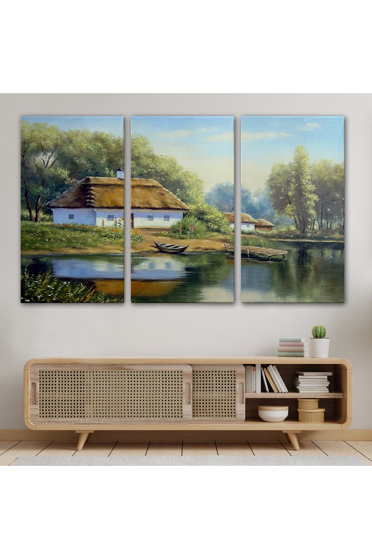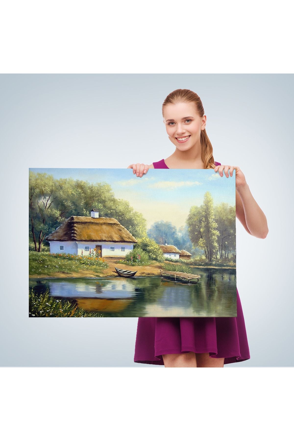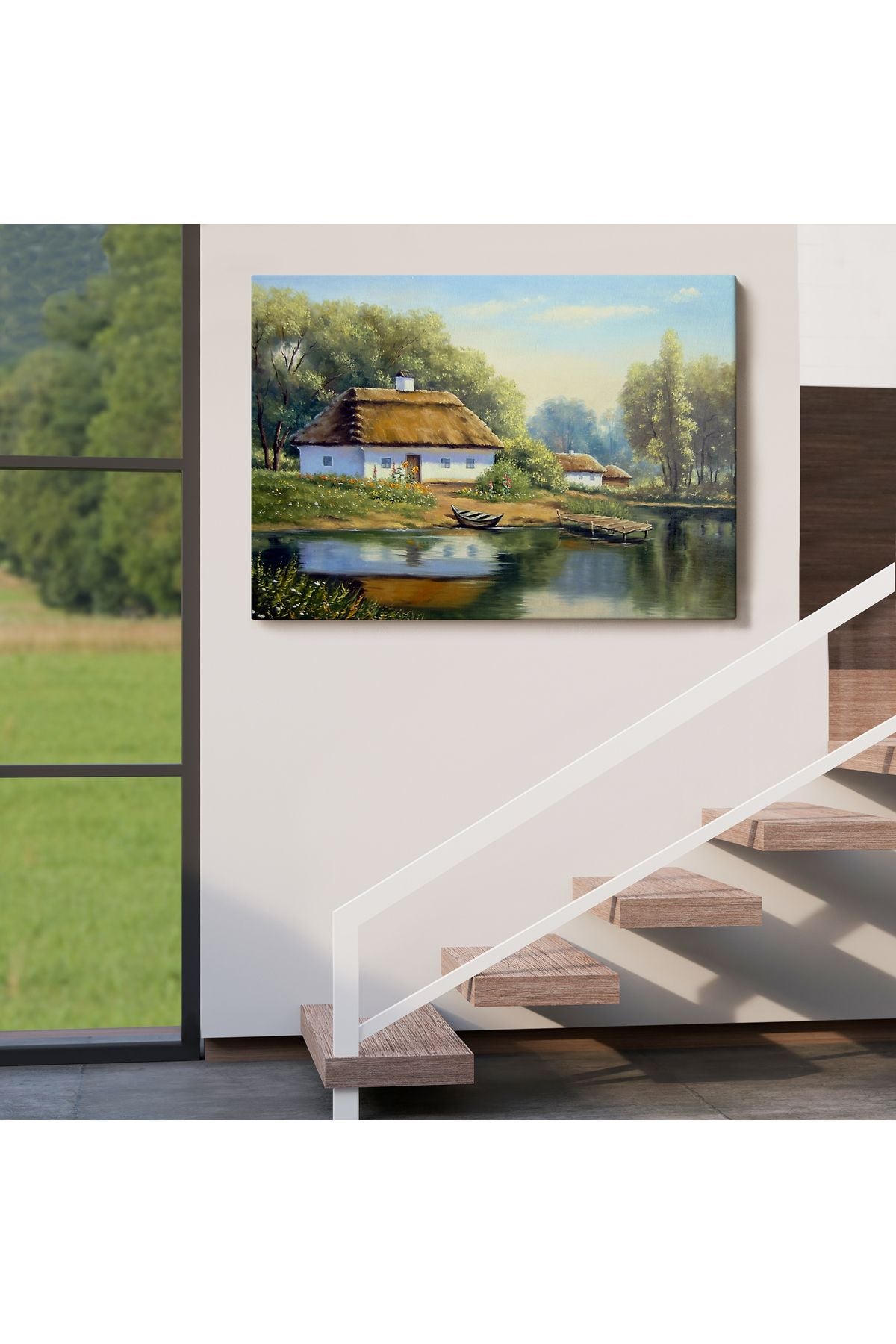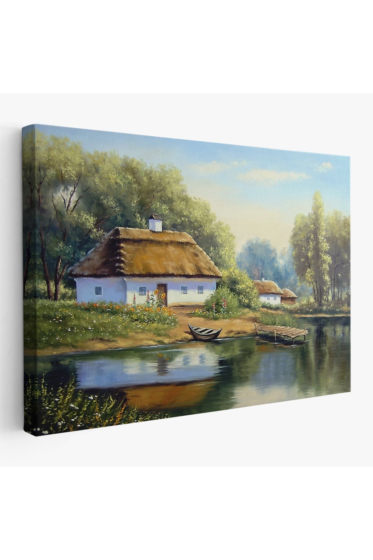 Göl Manzaralı Köy Evi Yağlıboya Görünüm Dekoratif Kanvas Duvar Tablosu-3510