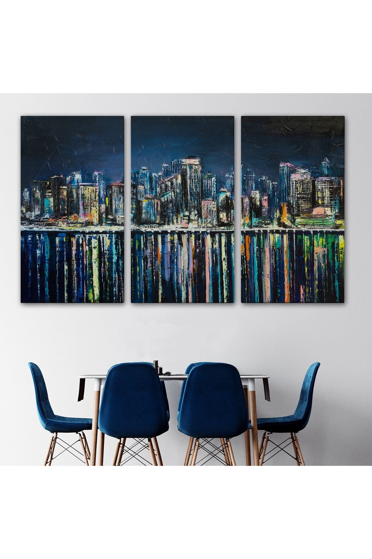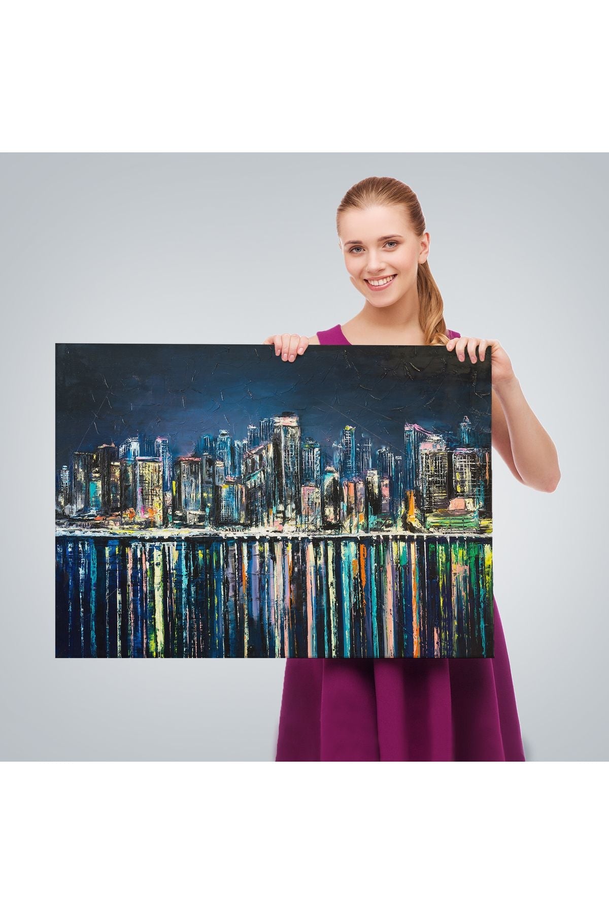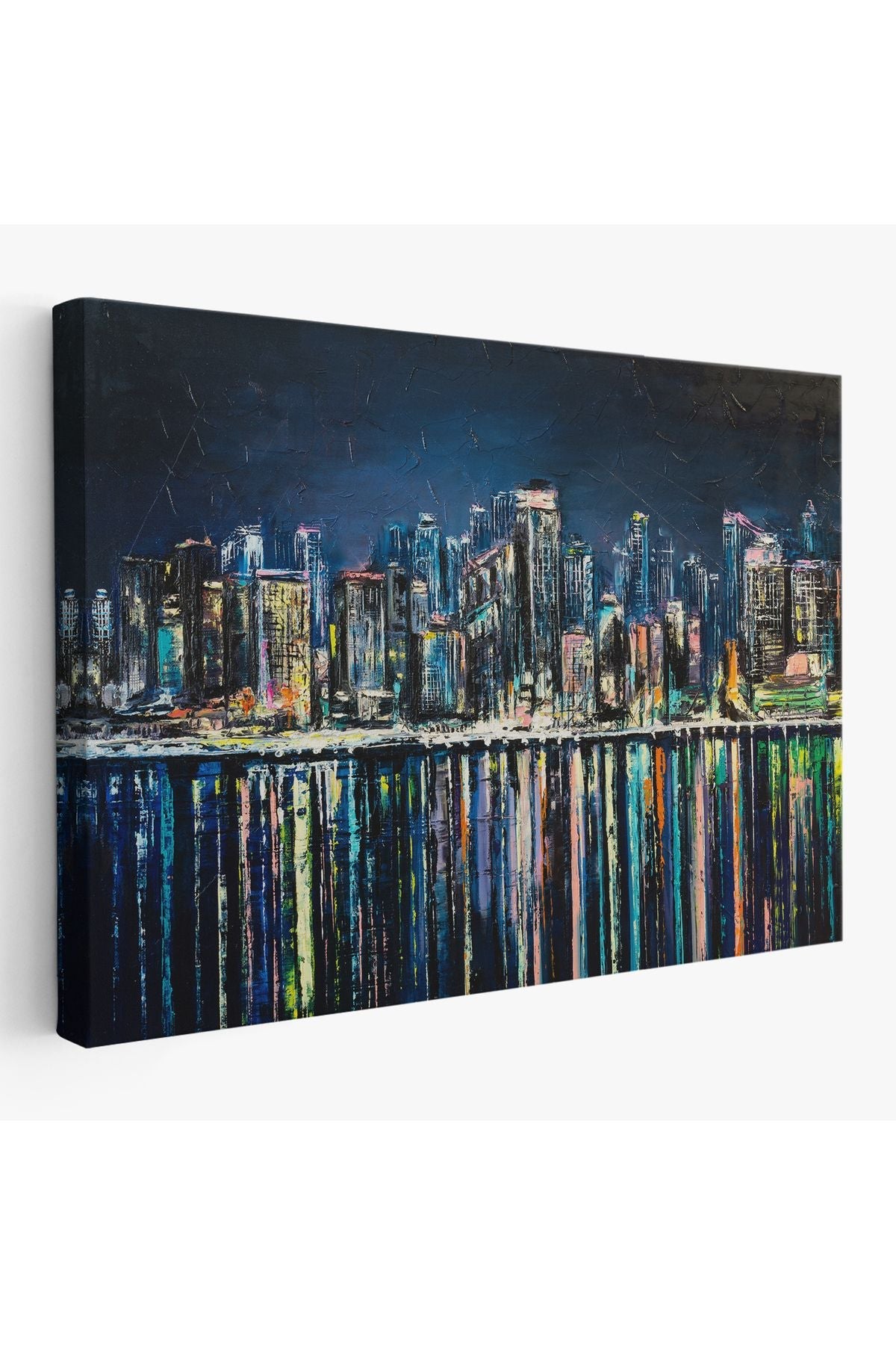 Kıyı Şehrin de Gece Yağlıboya Görünüm Dekoratif Kanvas Duvar Tablosu-3526