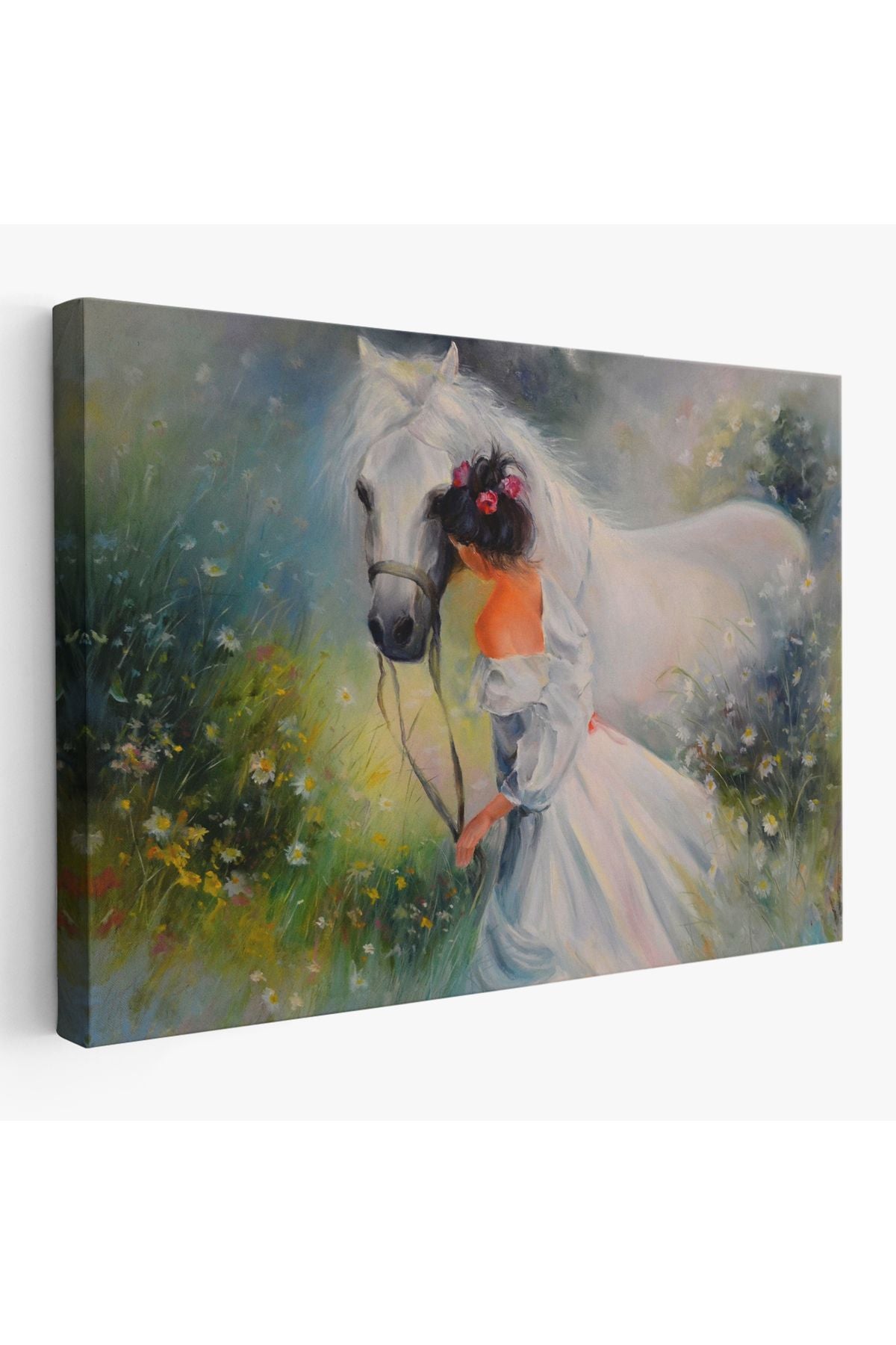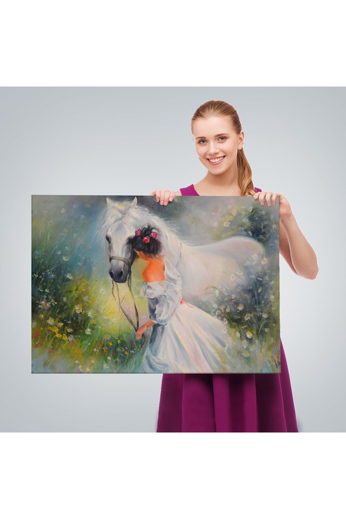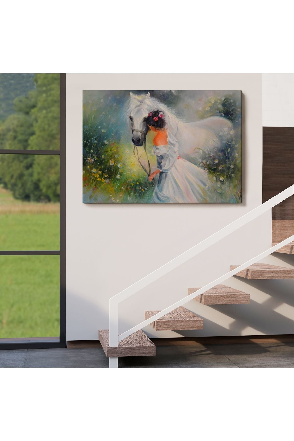 Bayaz At Ve Sahibi Kız Yağlıboya Görünüm Dekoratif Kanvas Duvar Tablosu-3539