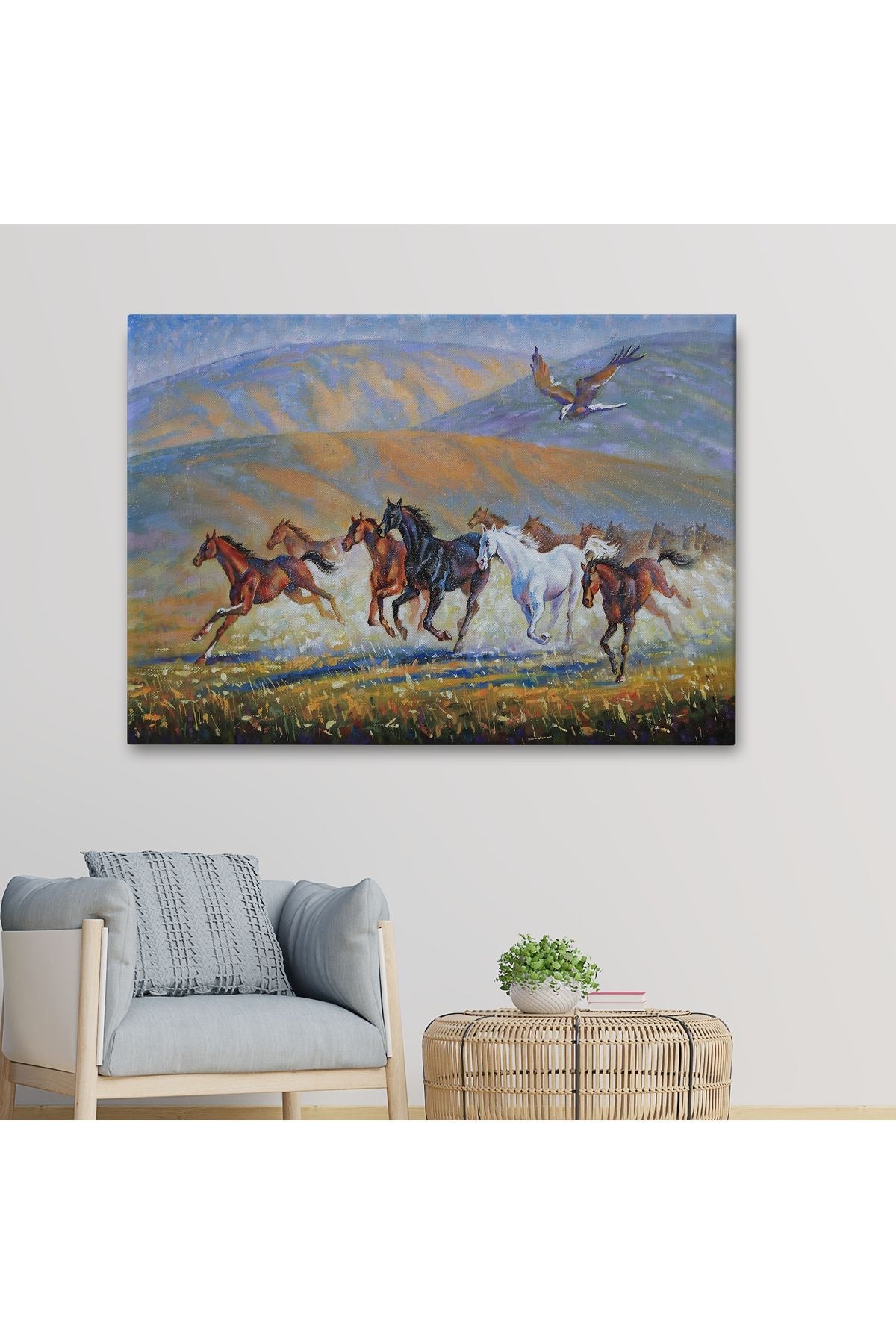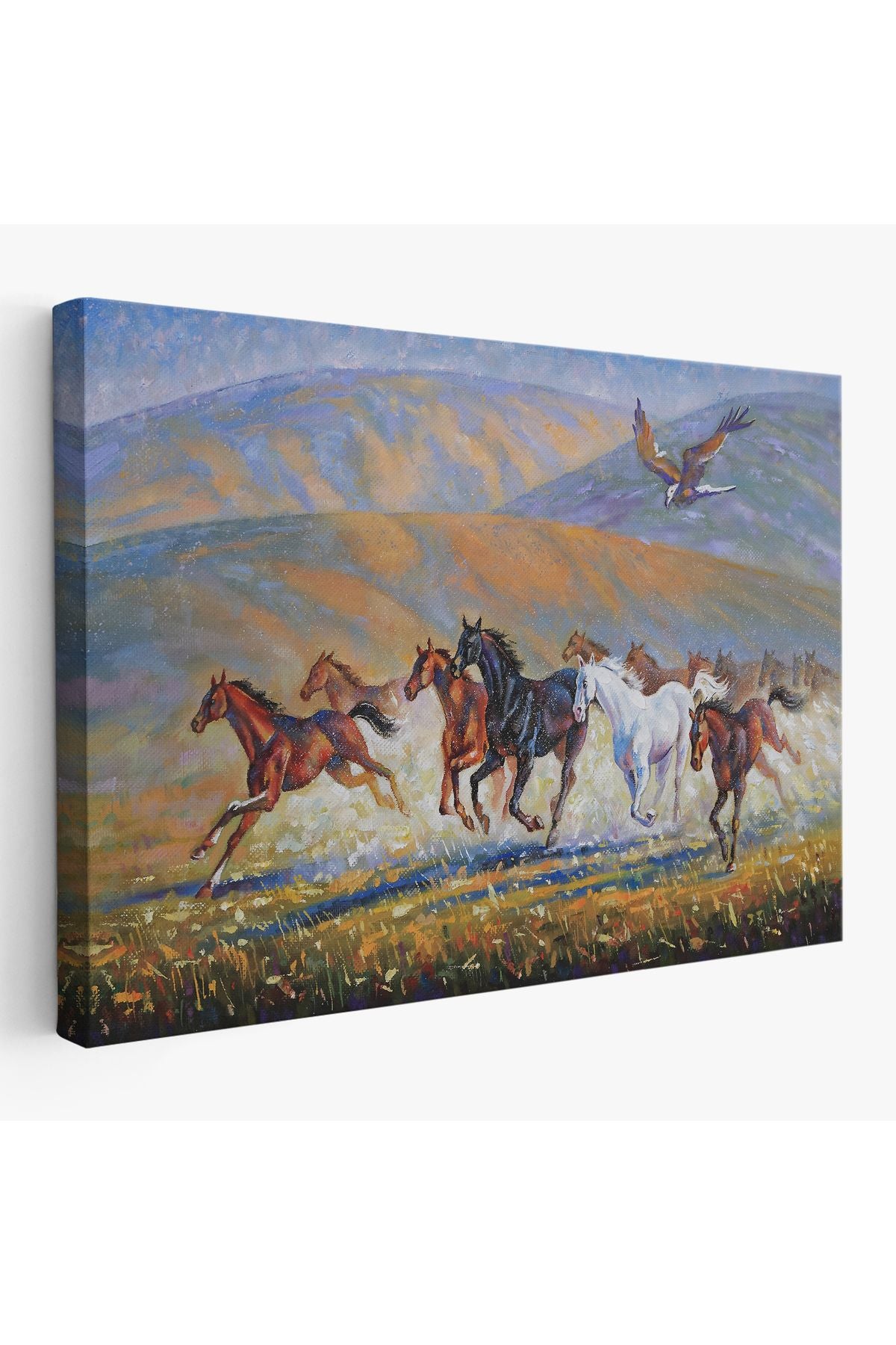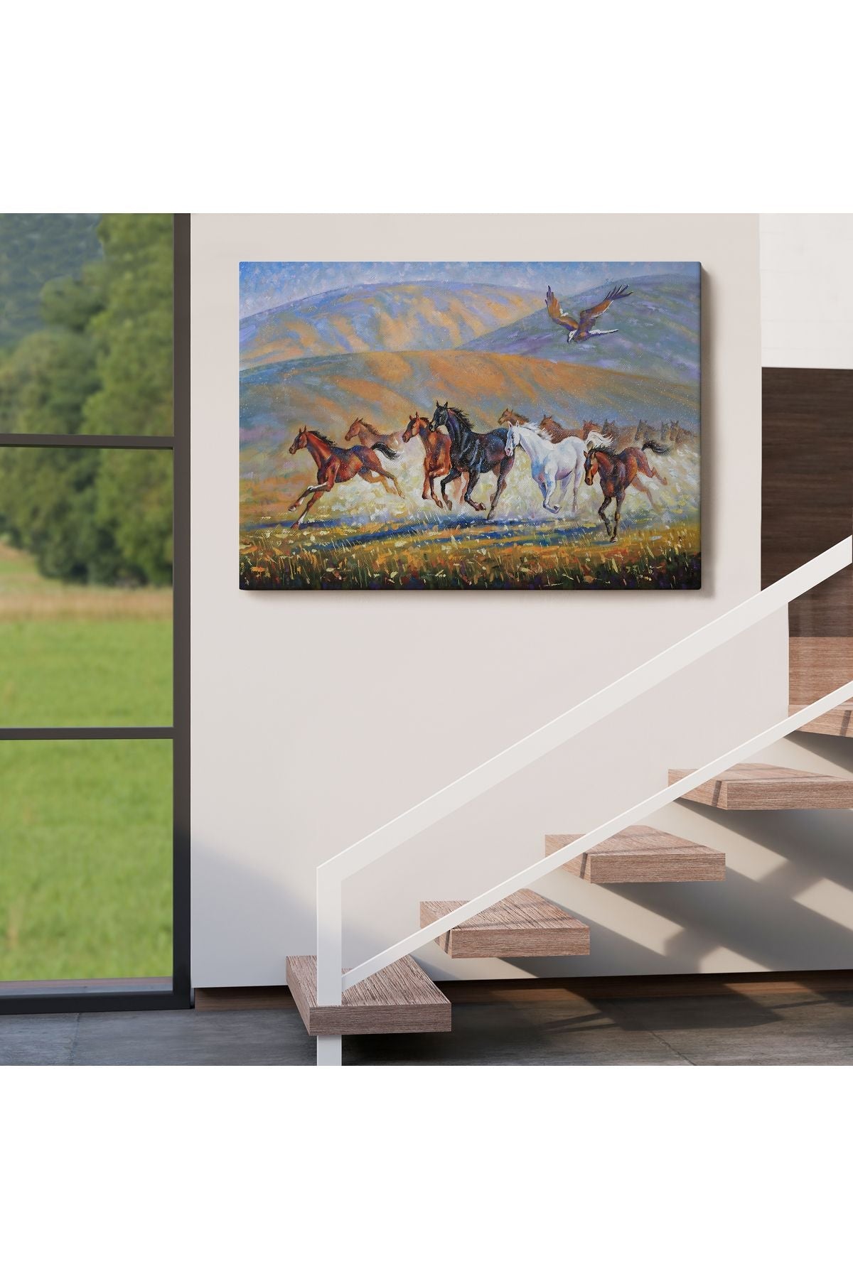 At Sürüsü ve Kartal Yağlıboya Görünüm Dekoratif Kanvas Duvar Tablosu-3600