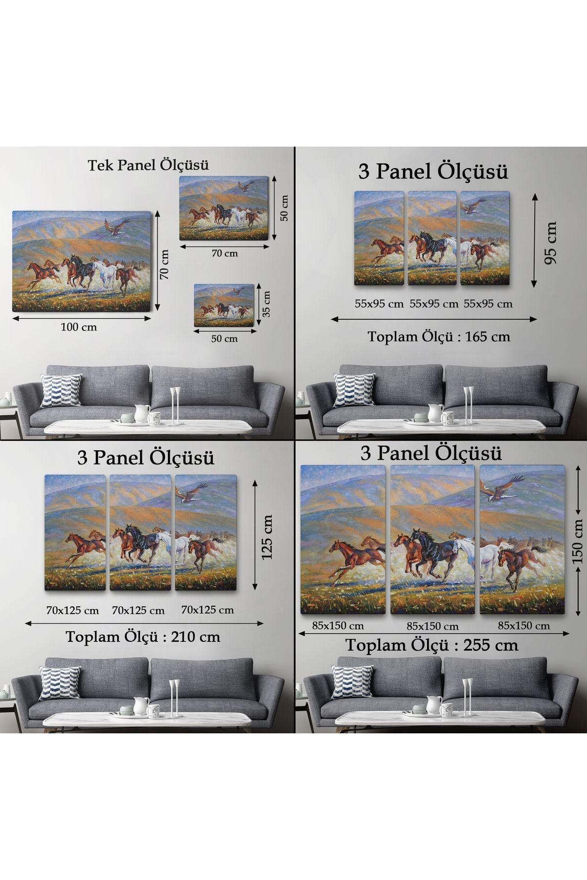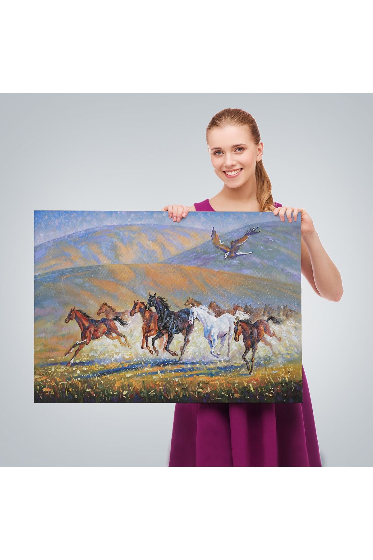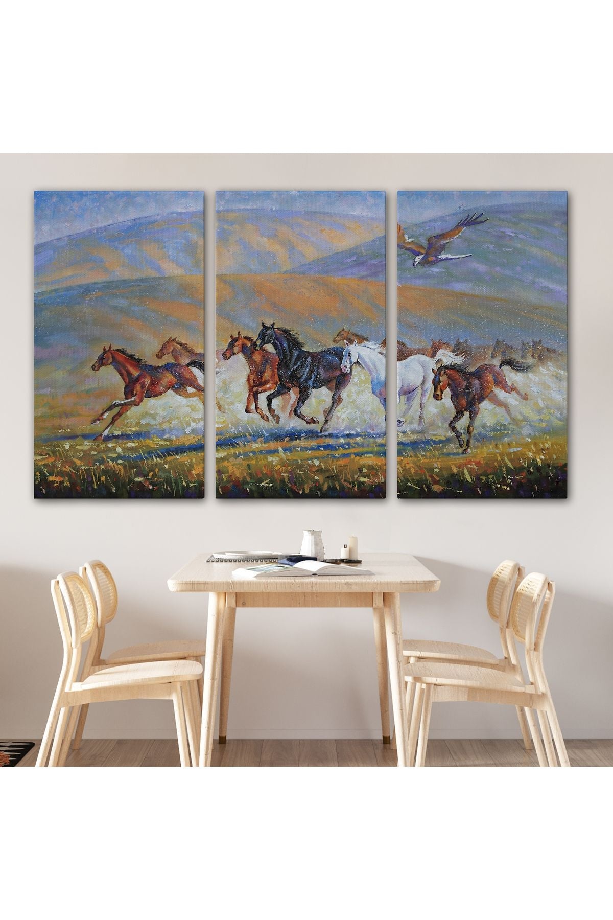 At Sürüsü ve Kartal Yağlıboya Görünüm Dekoratif Kanvas Duvar Tablosu-3600