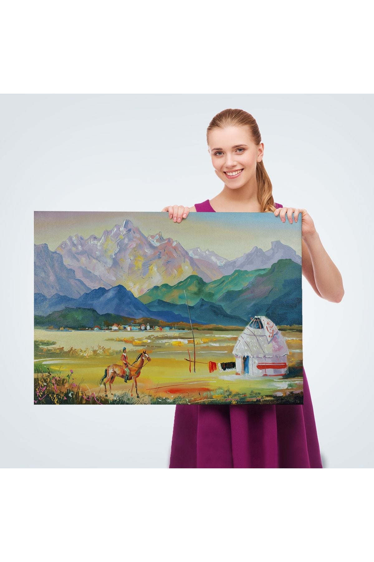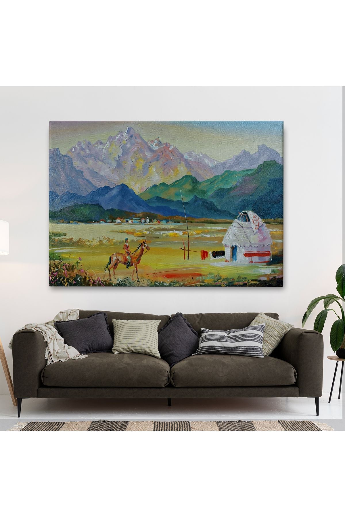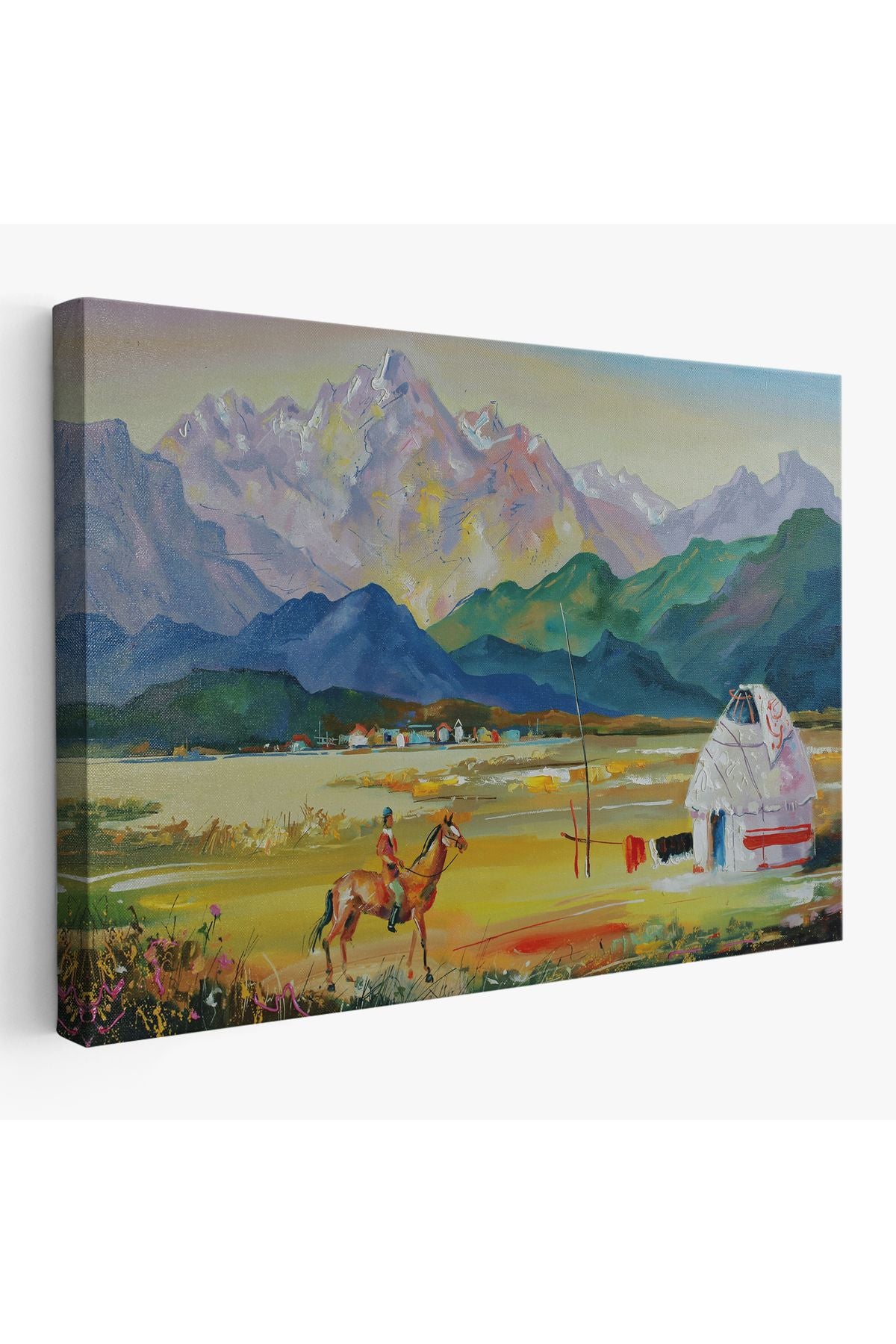 Kazakistan da Bir Göçebe Çadırı Yağlıboya Görünüm Dekoratif Kanvas Duvar Tablosu-3601