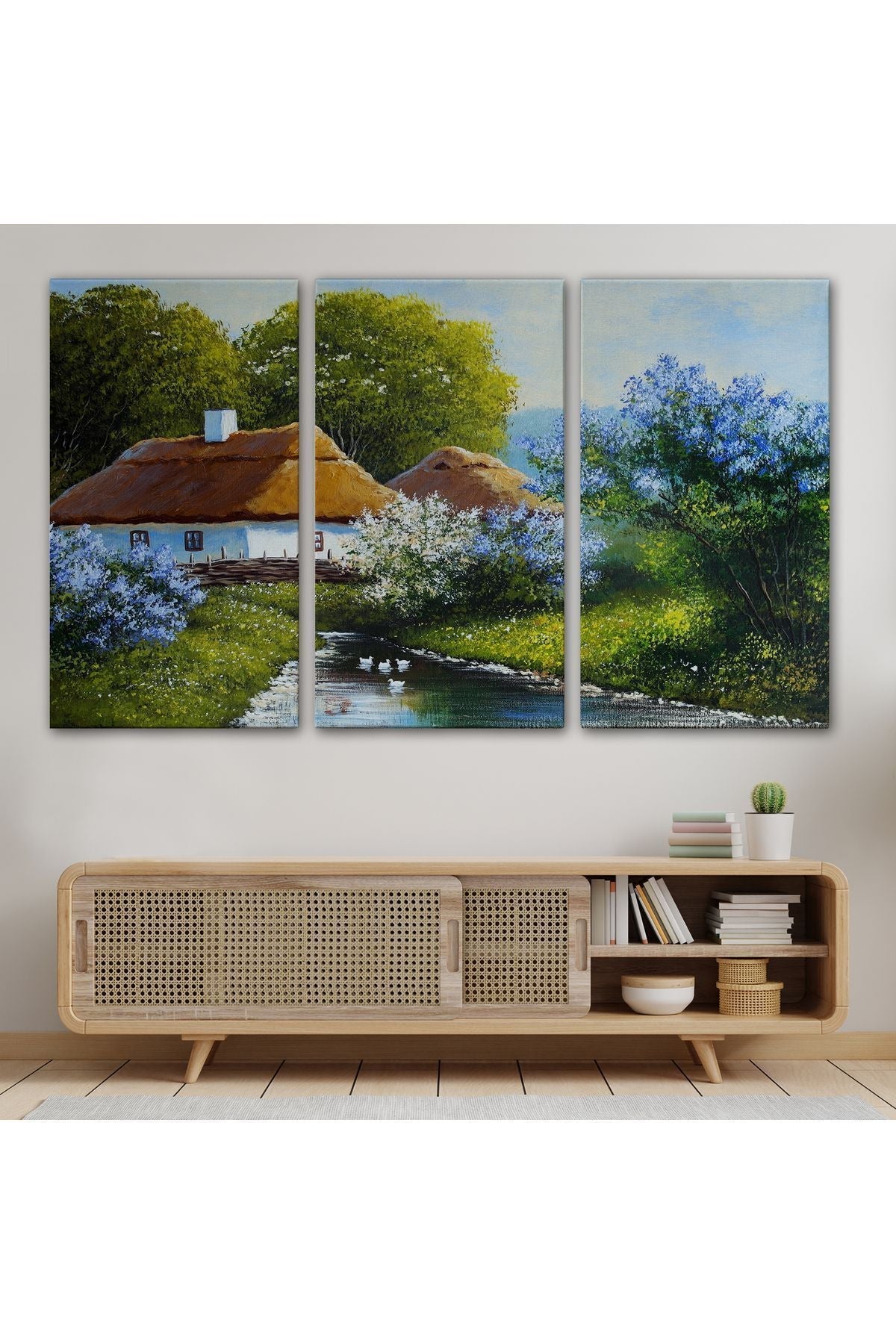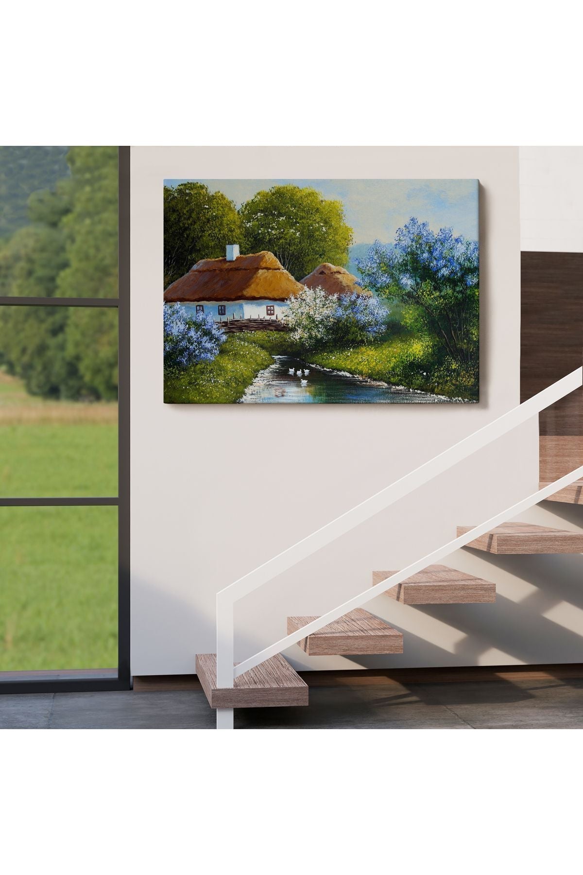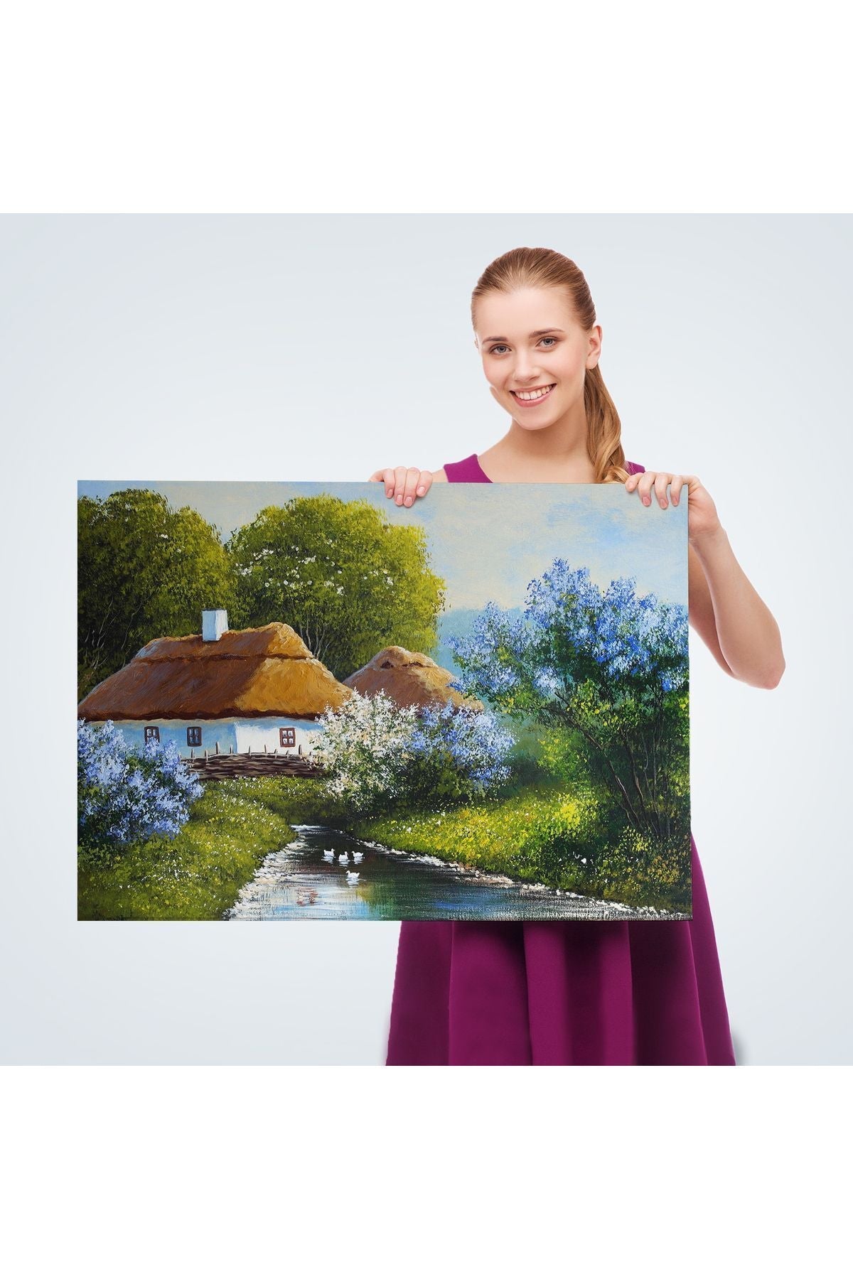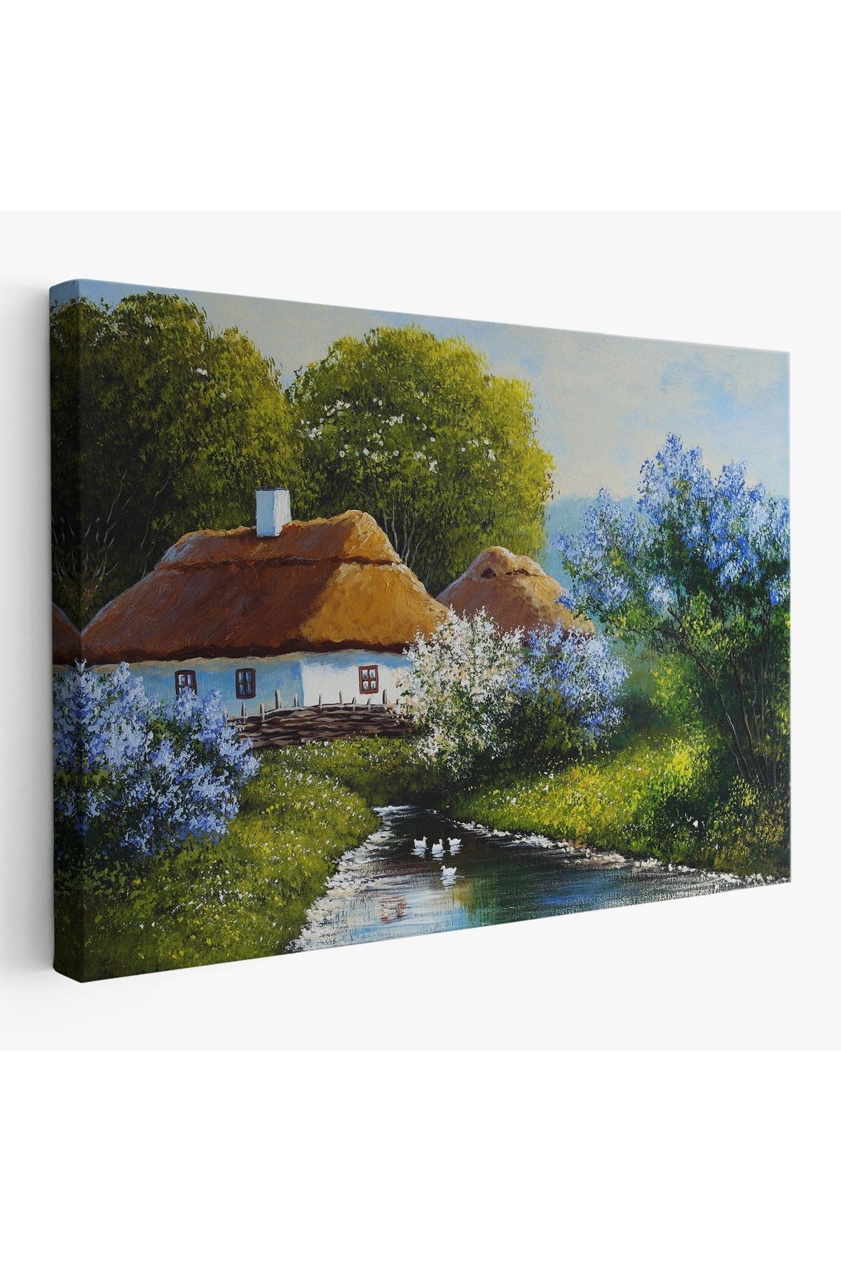 Akarsu Kenarındaki Köy Evi Yağlıboya Dekoratif Kanvas Duvar Tablosu-3637