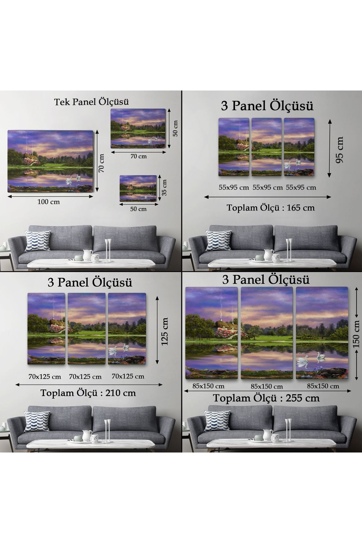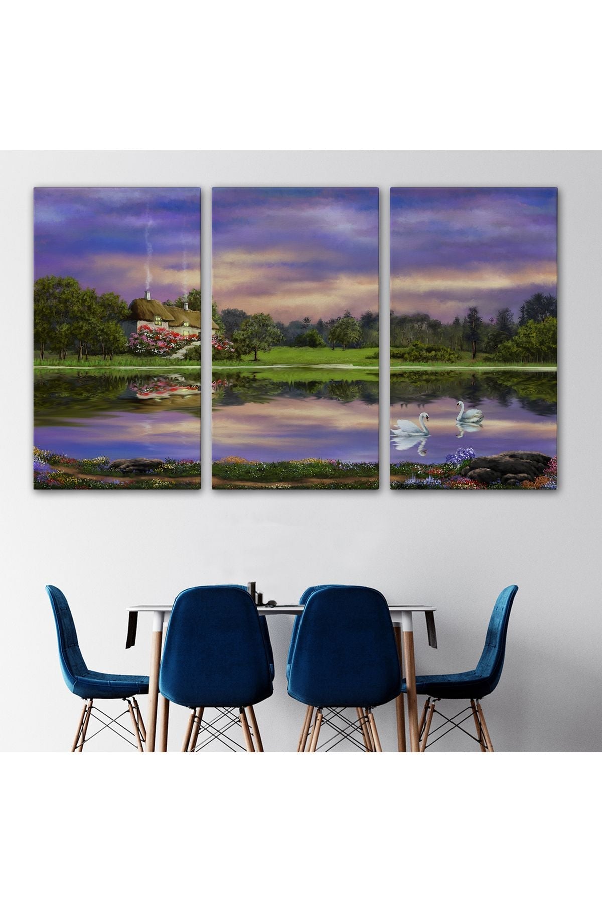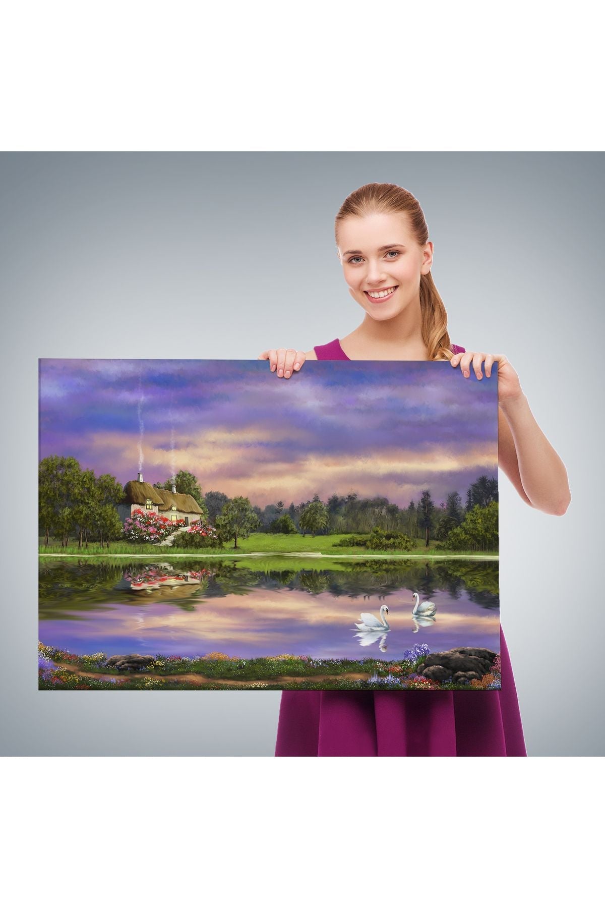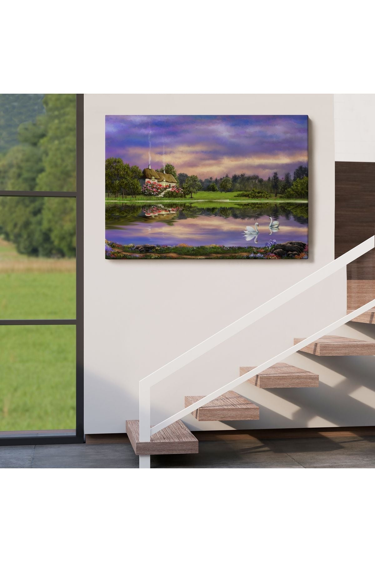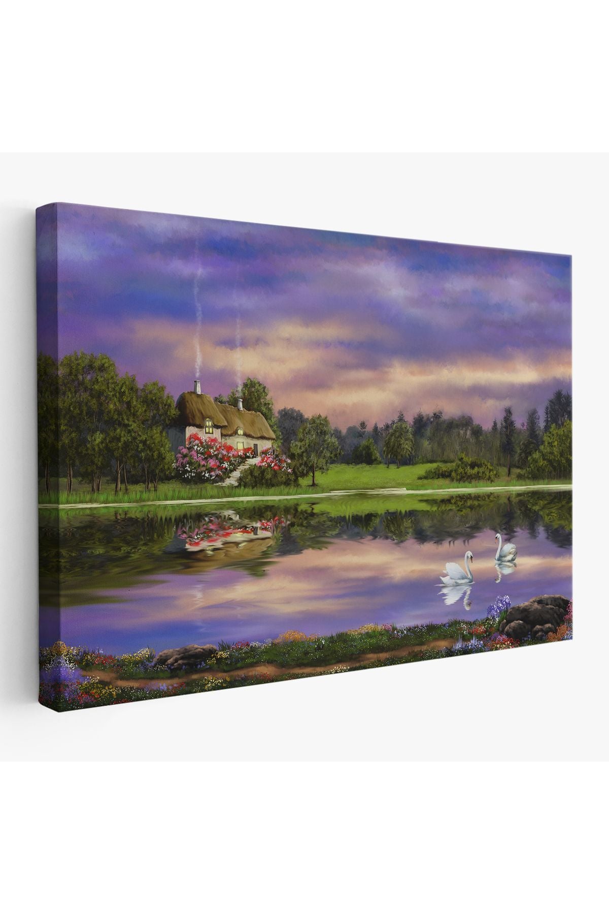 Göl Kıyısındaki Orman Evi Manzarası Yağlıboya Görünüm Dekoratif Kanvas Duvar Tablosu-3678