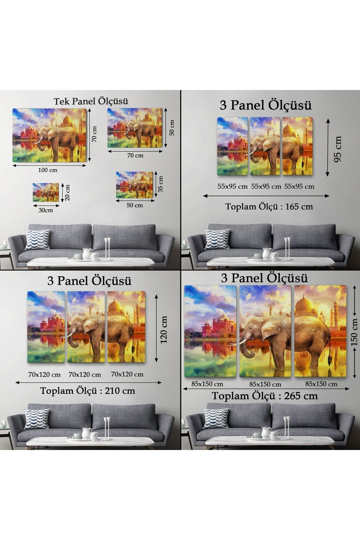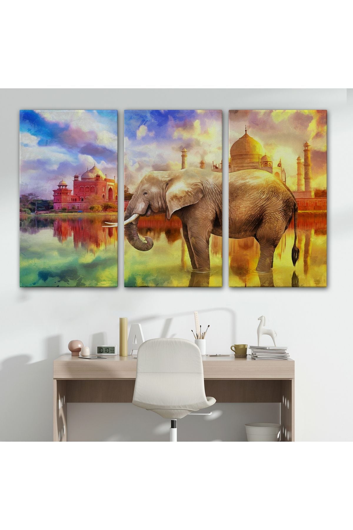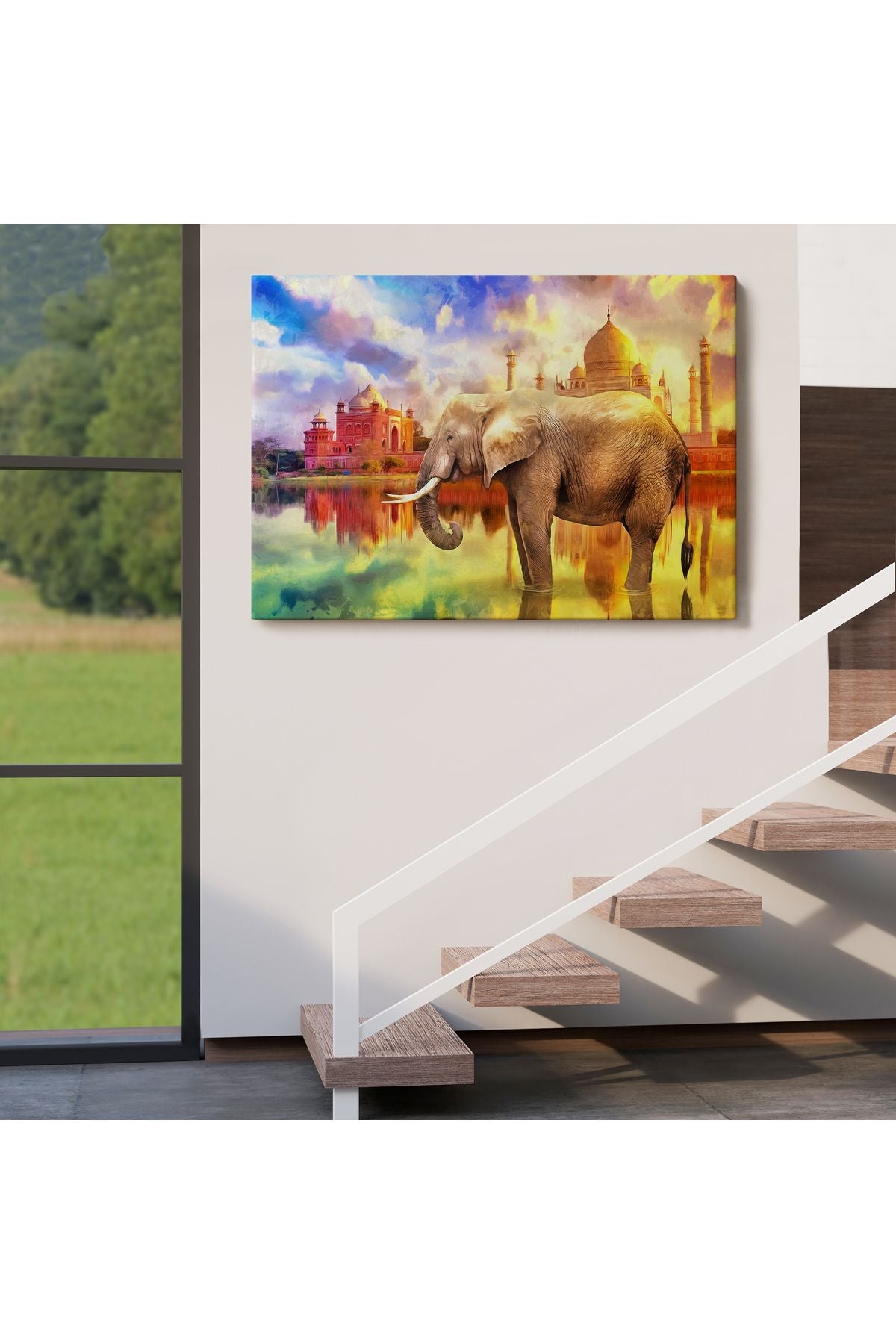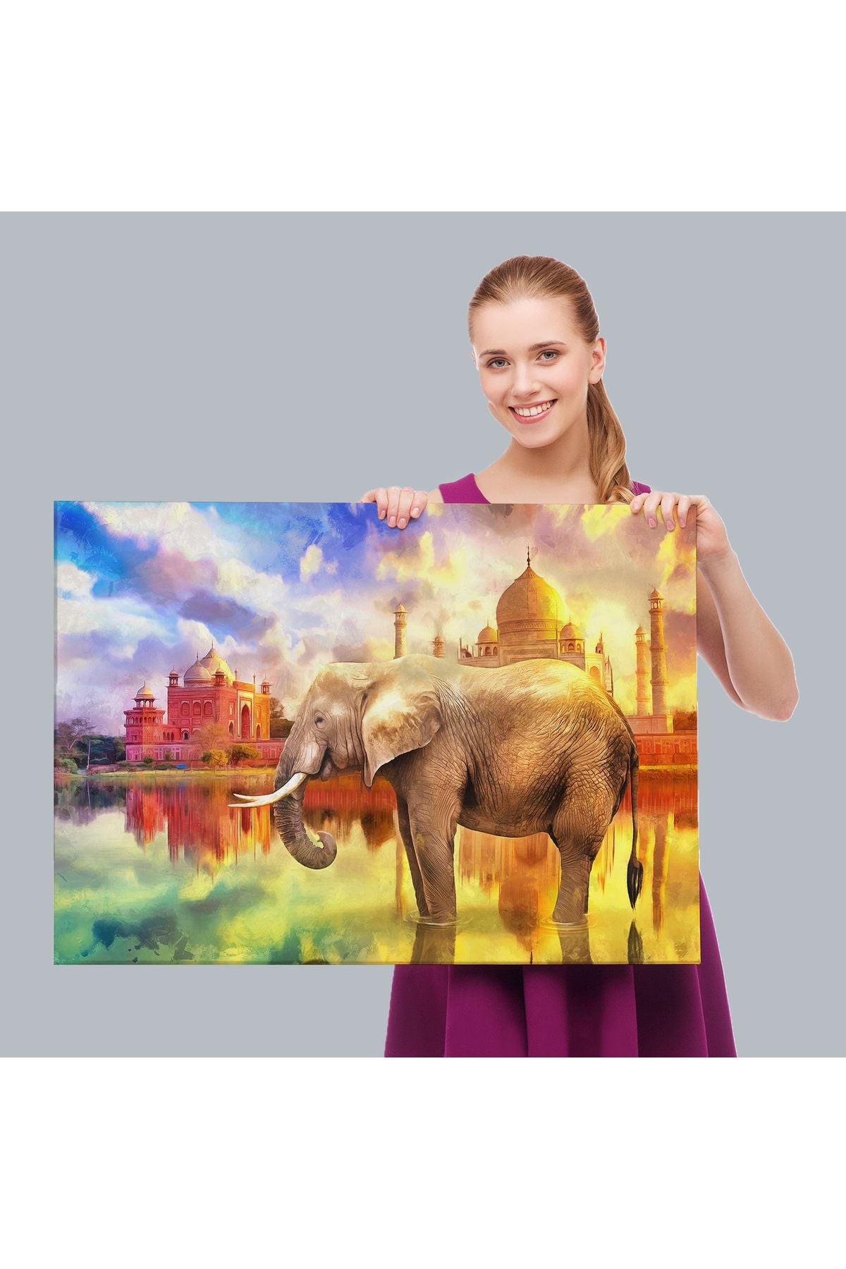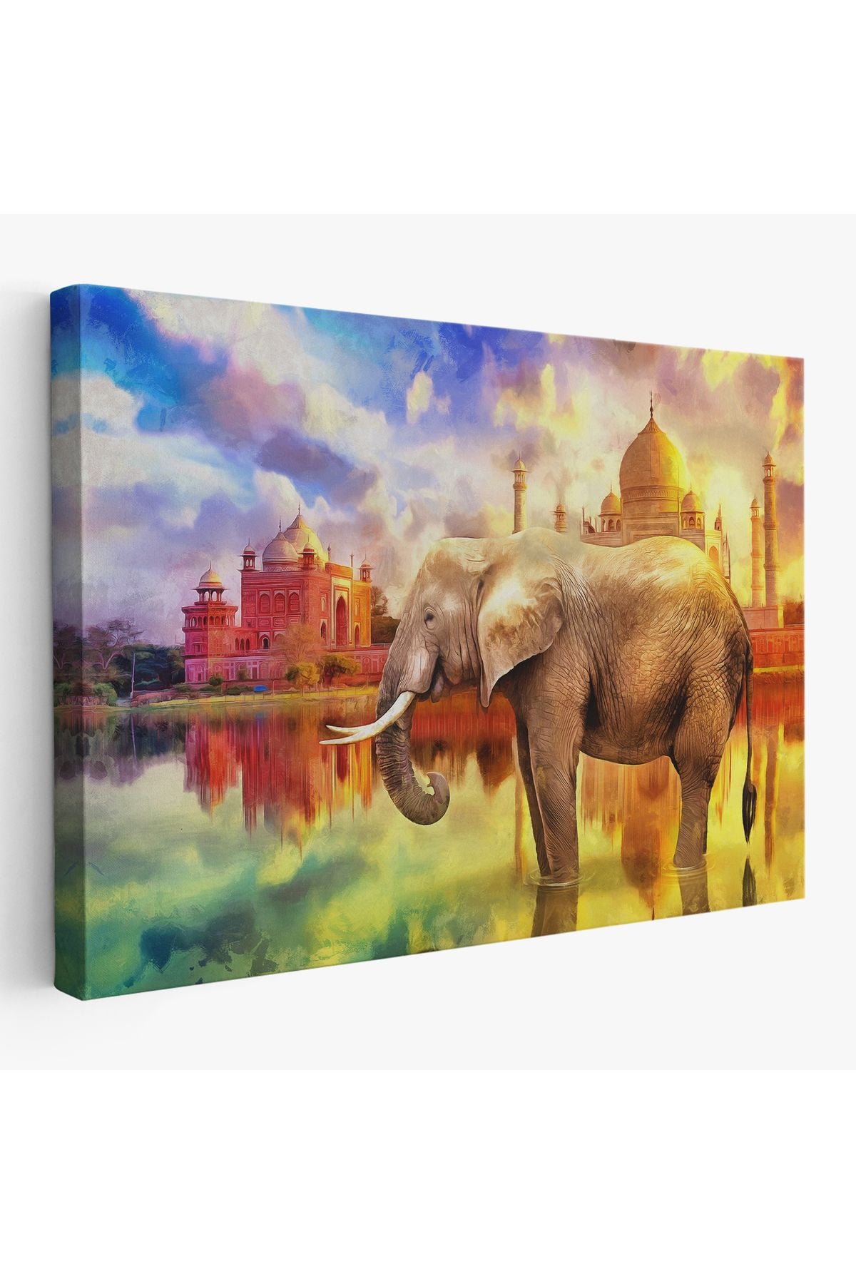 Fil ve Taç Mahal Manzaralı Yağlıboya Görünüm Dekoratif Kanvas Duvar Tablosu-3716