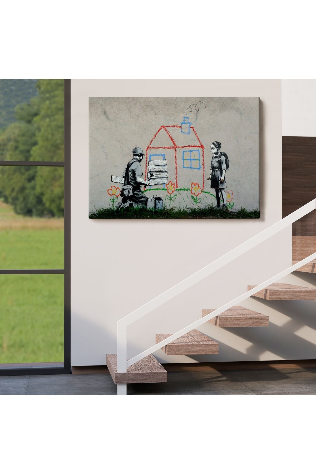 Bansky Çocuğun Çizdiği Evin Kapısını Kapatan Adam Kanvas Tablo-5019