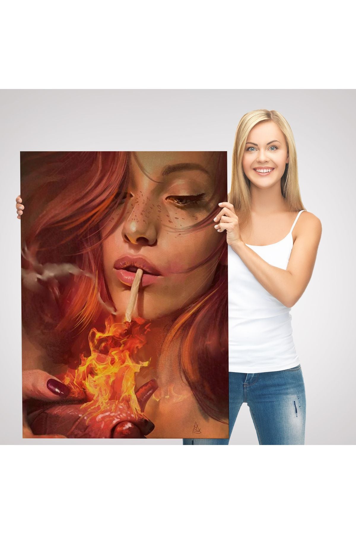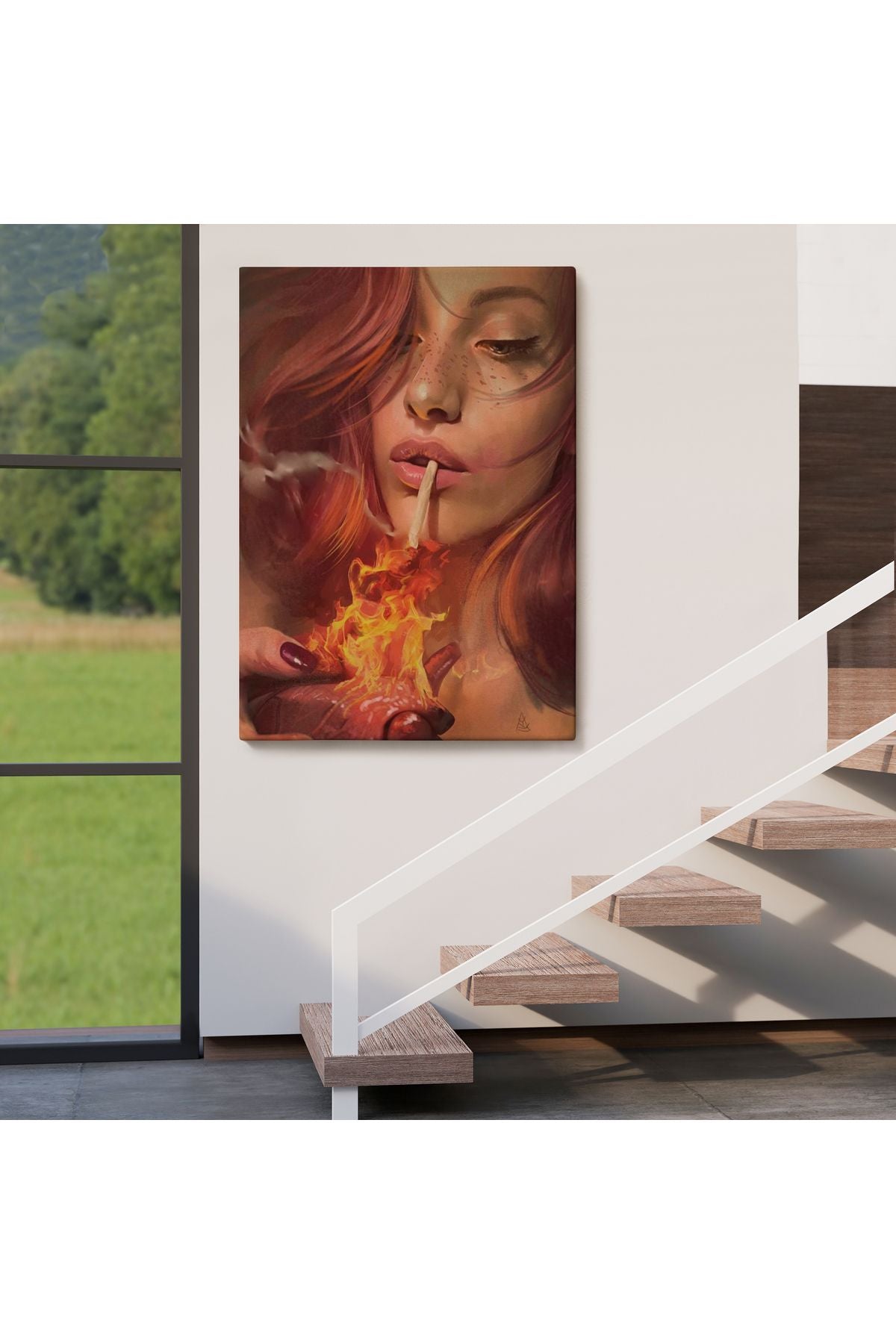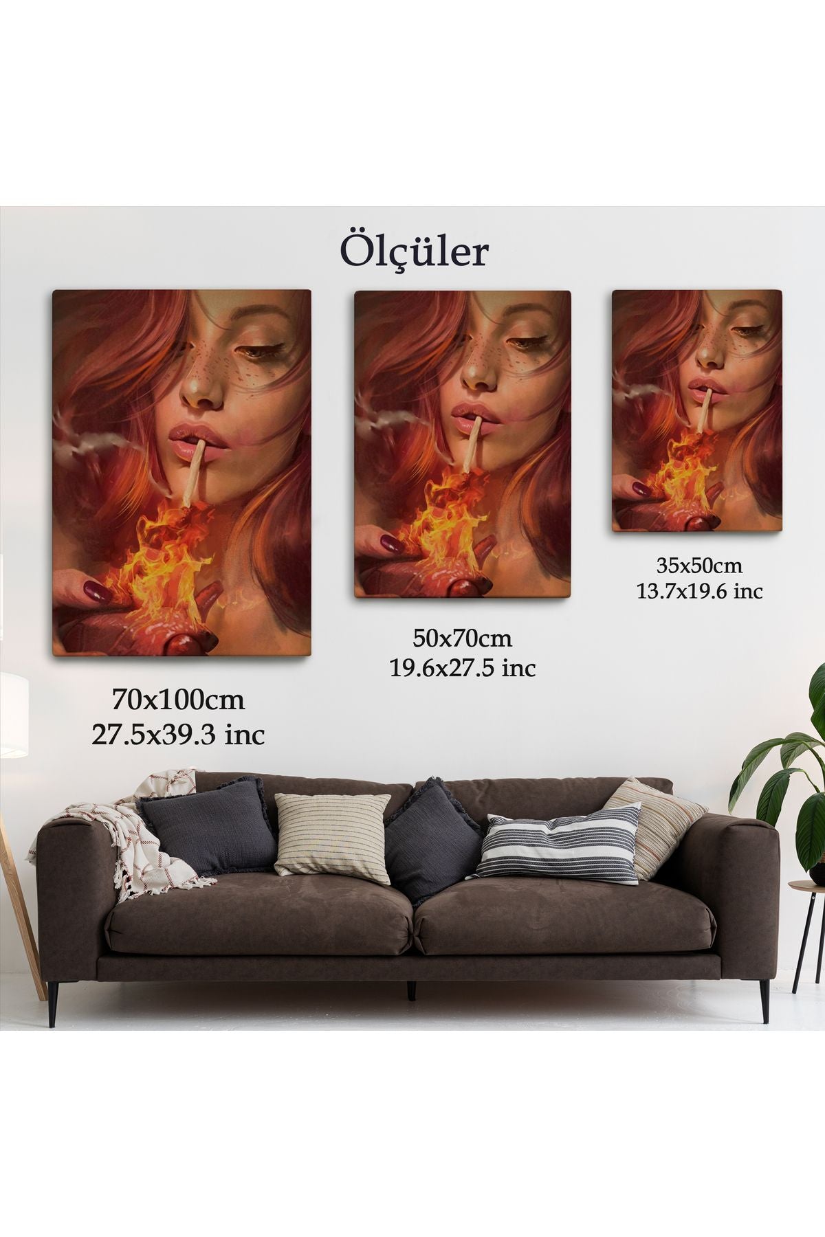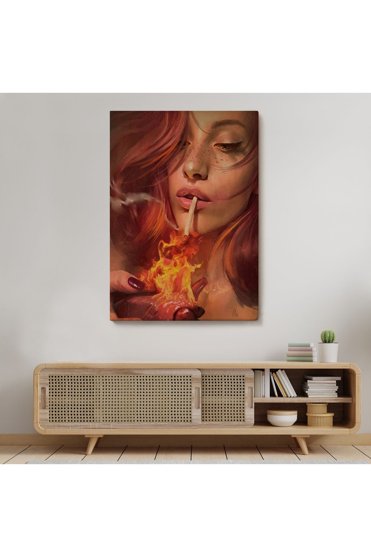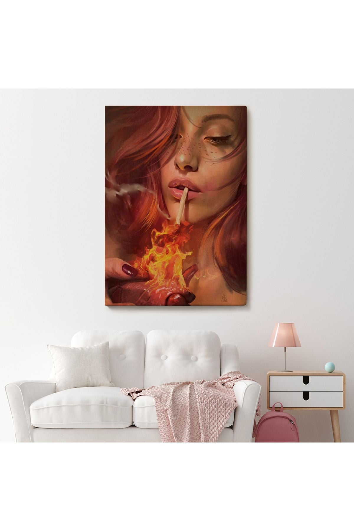 Platonik Aşkın Tavrı Sigarasını Yanan Bir Kalpten Yakan Kadın Kanvas Tablo-5247