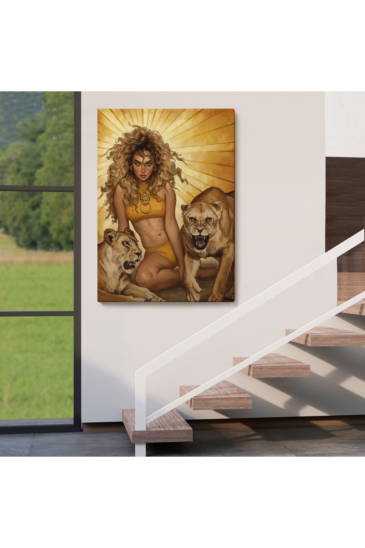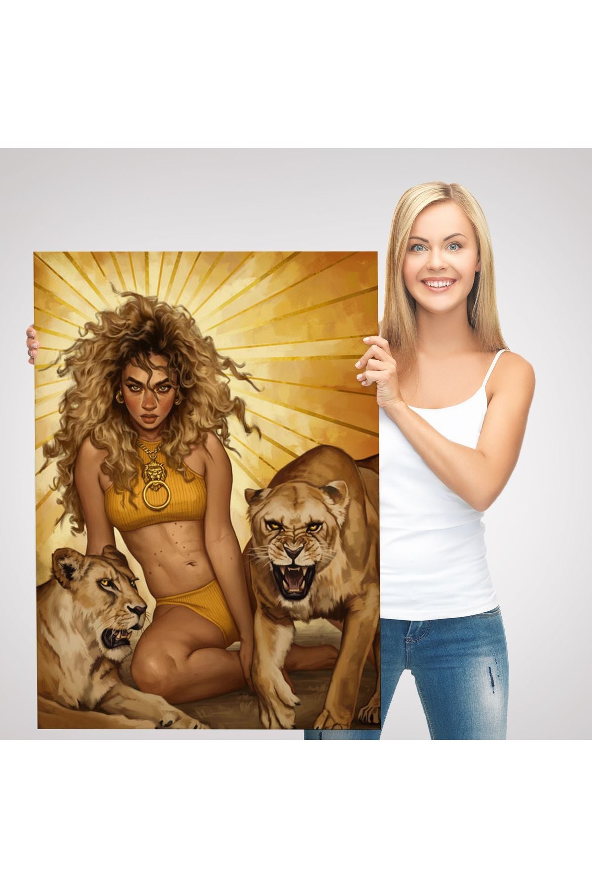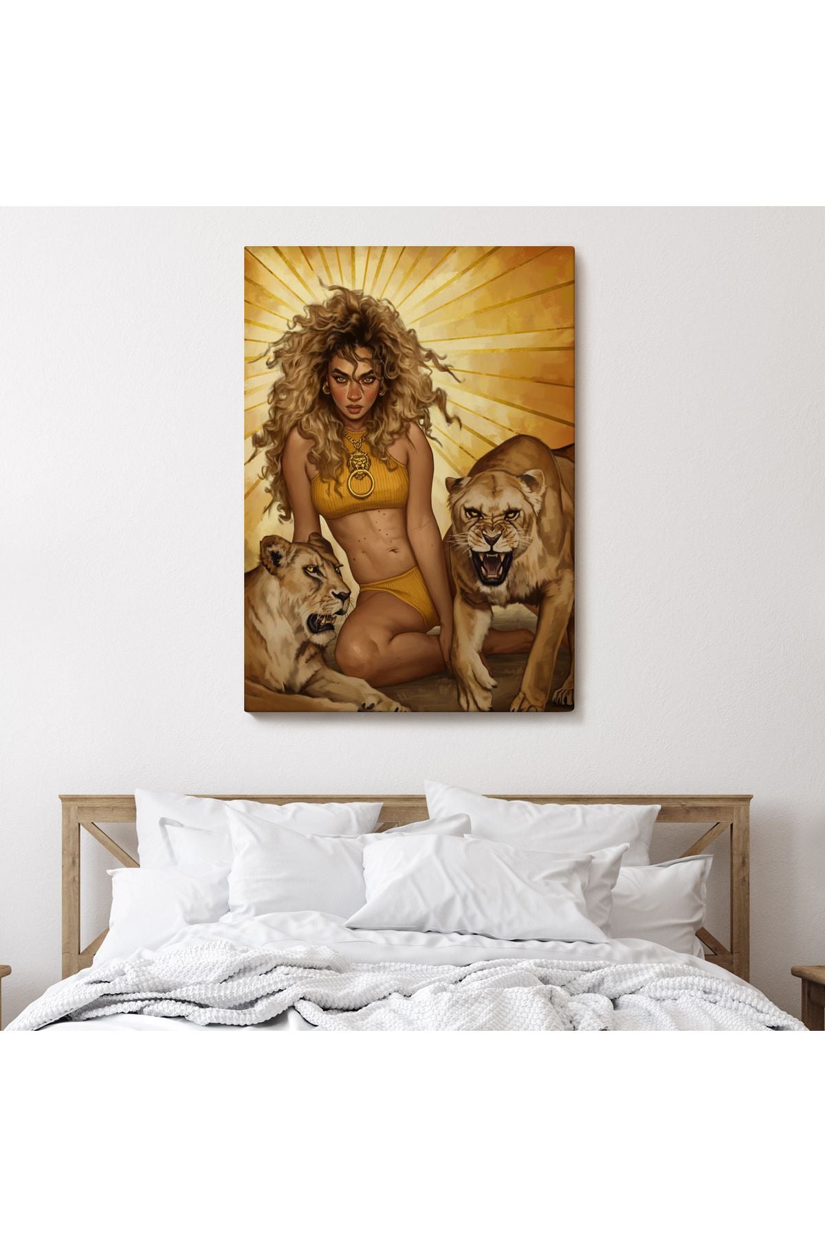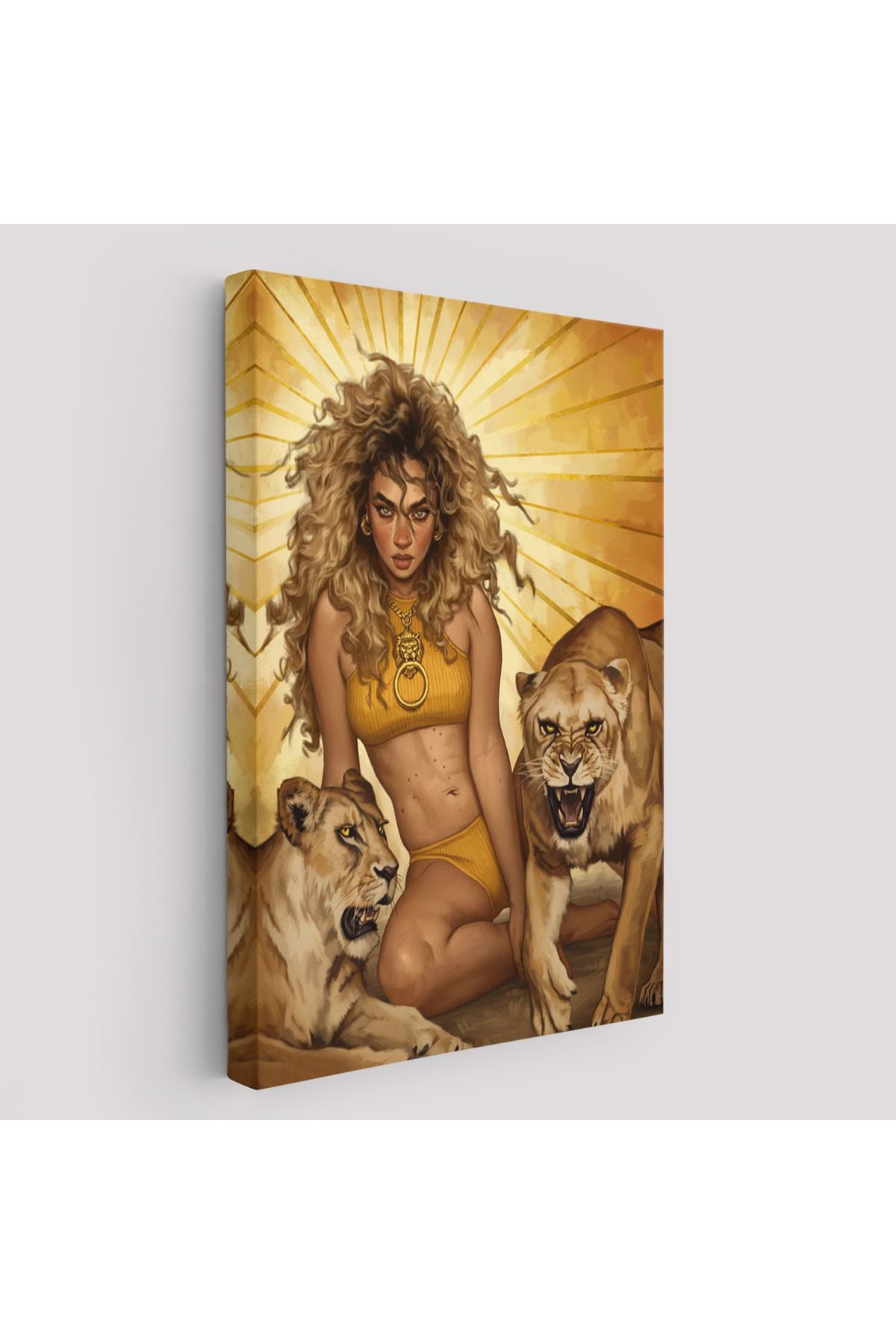 Aslanlarla Oturan Sarışın Vahşi Kadın Kanvas Tablo-5278